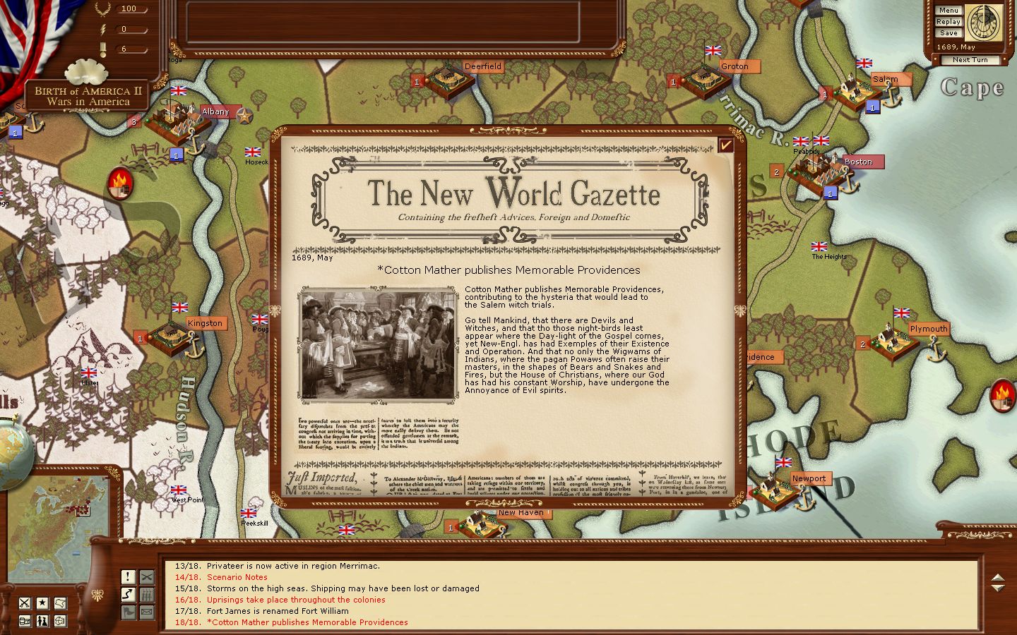 Hi folks, in case you are thinking of trying the scenario you may want to wait for a few weeks. I will post a new patch when I have had time to test it with the following changes (and possibly one or two others). I'm hoping that this will be the final patch, but I may put some work in to create a scenario that is playable against a British AI once King William's War is complete (unless I start work on a Peloponnesian War scenario).
