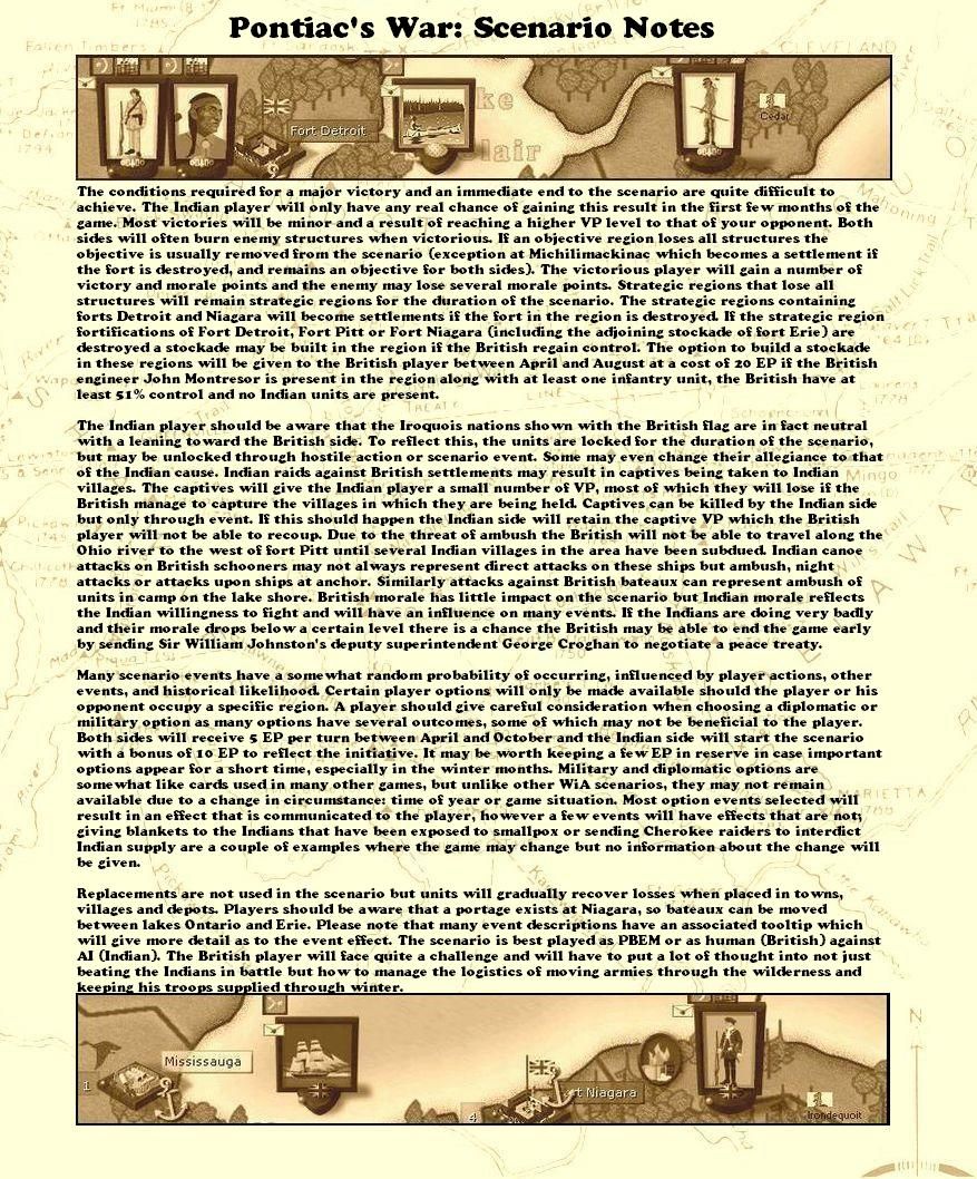 Hobbes wrote:I’ve never seen Fort Niagara taken! Detroit and Pitt are both without Depots at start. It sounds like you played the scenario very well – much more aggressively than I have ever tried. Thanks for the thoughts. I doubt I will make many more revisions to Pontiac but I will keep them in mind for the next scenario.