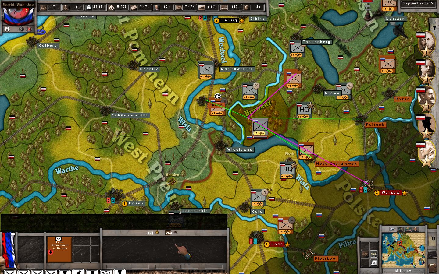 A Russian offensive in the Spring of 1915 made significant advances into East Prussia but Eighth Army successfully attacked their flank and surrounded most of their Second Army. The Russian forces should be isolated but as can be seen from the screen shot they are getting supplied through a German occupied province and a theoretically impassible lake hexside.