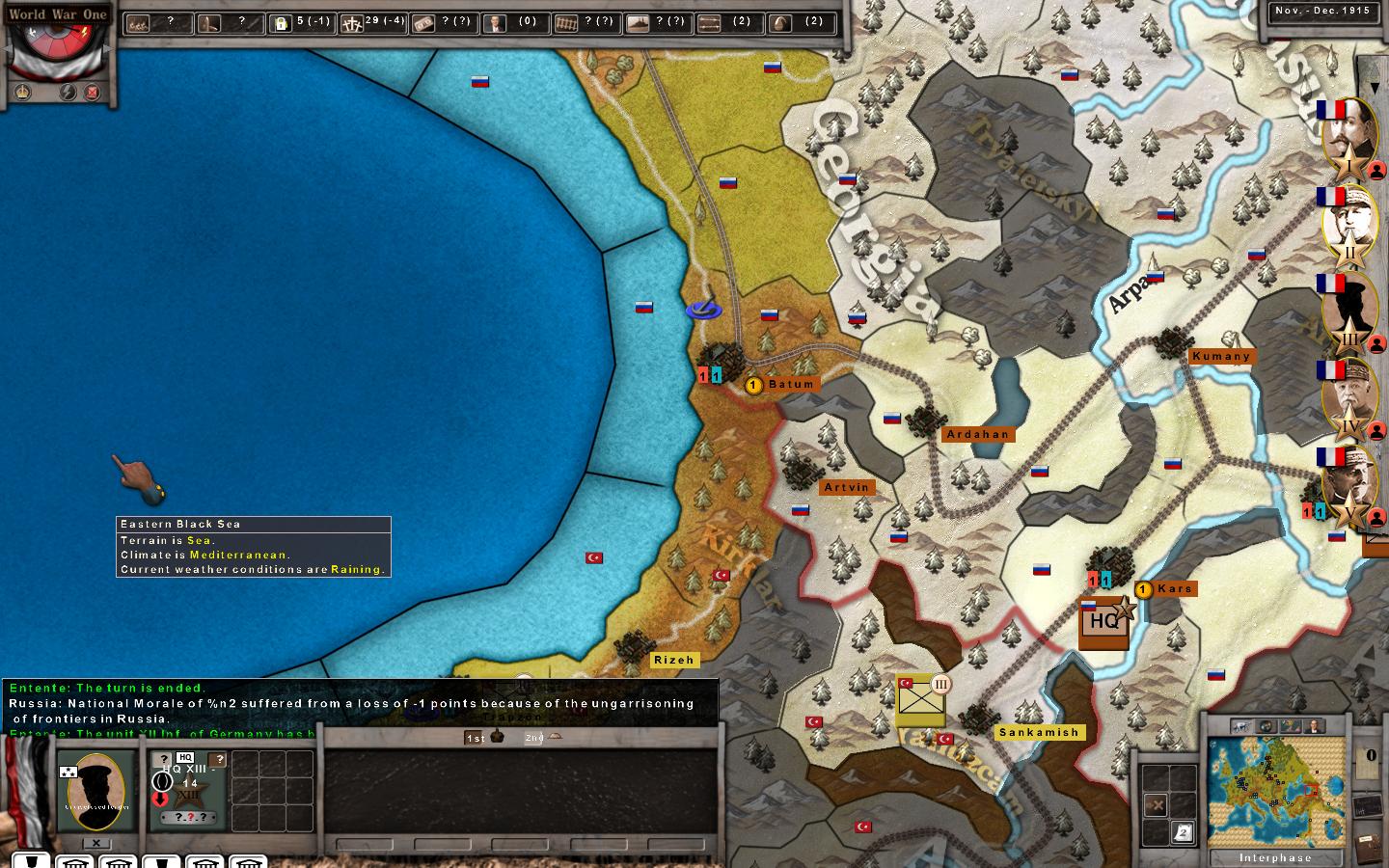 A detachment of British V army was transported last turn to Salonika. We have right of passage from the Greeks - in fact, according to the diplomatic display, we have full access to Greek territory, not just Salonika. The French did their option to land their army there this turn as well. The French are in supply but the British are not. Any ideas why? The Turks are still neutral and there are no Central Powers naval units around.