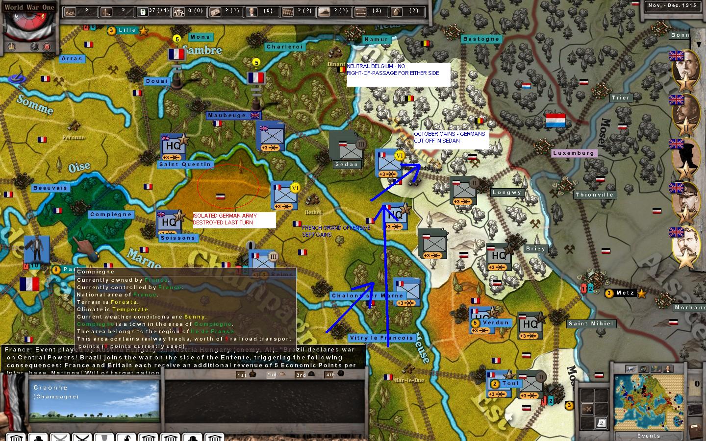My 1915 French Grand Offensive was a spectaular success, helped in part by a major German attack the previous turn that went badly wrong for them. As can be seen in the attached screenshot, I have pinned a large Geman force in Sedan against the Belgian border.