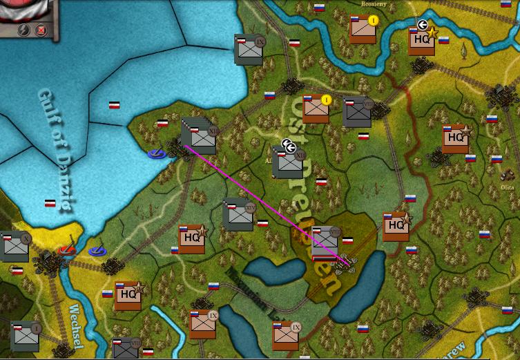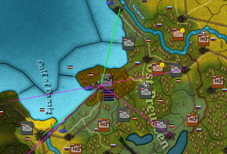 1. The tip of the pocket at Loetzen (Gumbingen shows the same) simply shows a single pink line to Konigsberg. I believe this indicates a supply line to a supply source. Memel, and this is the clue to what's happening, also shows a single pink line (not shown here) to Konigsberg when selected (I suppose it's 2 controlled sea regions away?).
