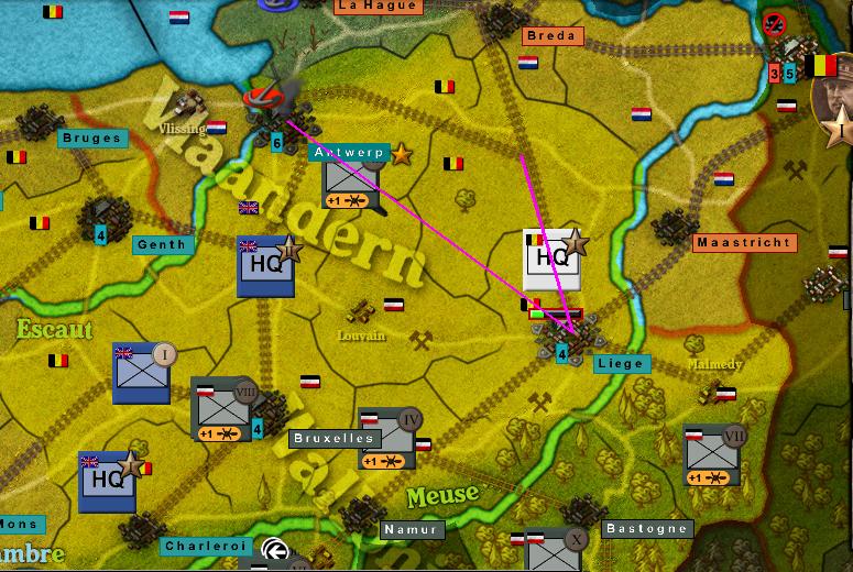 As for Belgium, I suppose the only option is for Britain to launch a Grand Offensive immediately with the objective of taking Mechelin and its railway junction SW of Antwerp. That should allow the Belgian Army to survive. Failing that maybe I should station one each of its Corps in Liege and Antwerp. Either way we'll fight on!