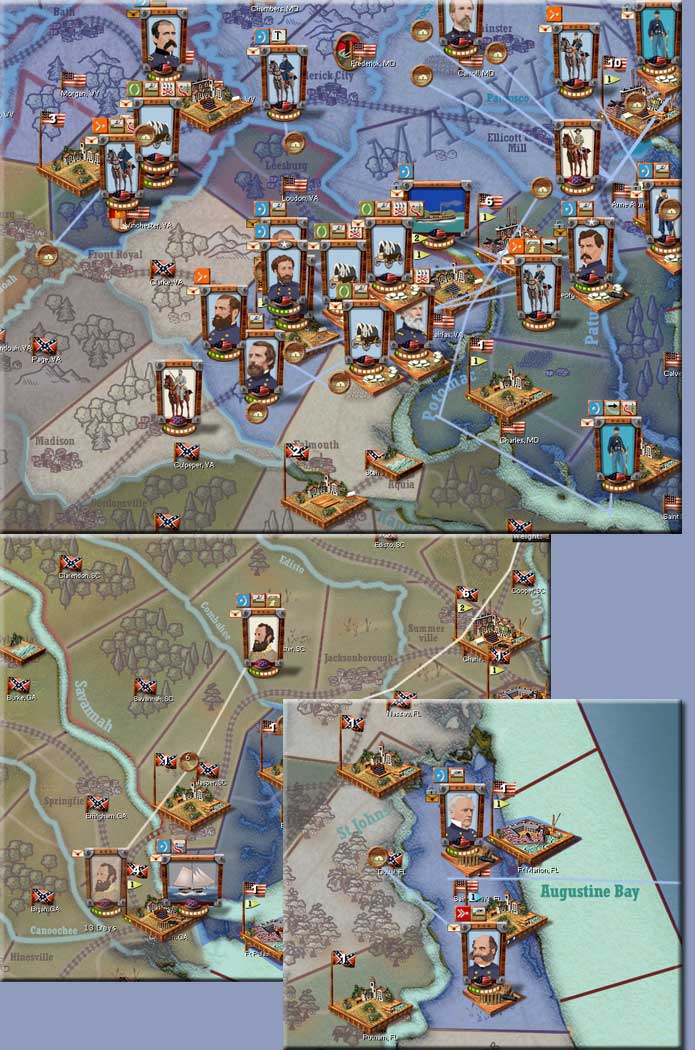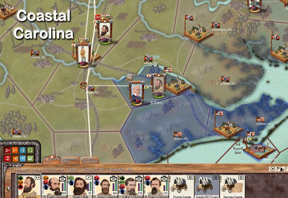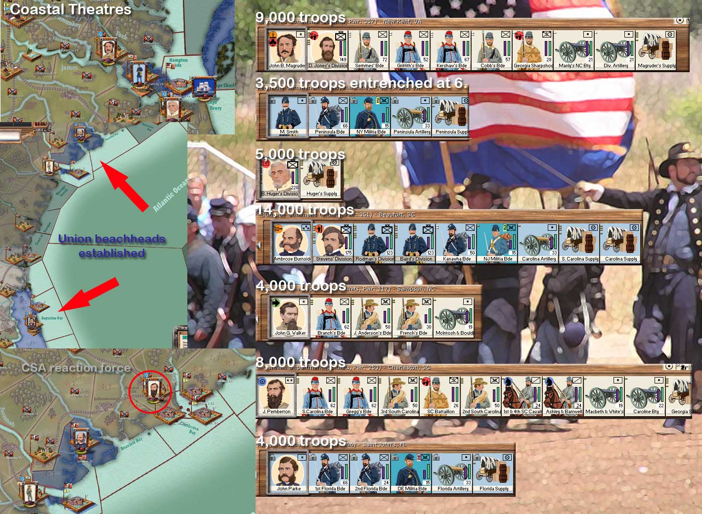 In South Carolina and Florida the United States has made two incursions with some sizable forces. The South has a reactionary force in Charlotte of approximately 10,000 troops. Also, there's a reactionary force somewhere in North Carolina. Altogether there about 30,000 Southern troops in the coastal region facing proximately the same amount of Union troops.