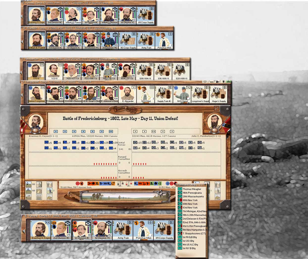 States casualties are caused by the 64 guns raining lead tear down upon them. The CSA charge overruns the rest, wiping out two line regiments. During the retreat the fleeing Union troops managed to spike 12 of their 10 pounder's before the Confederates were able to capture them. About 900 men are able to escape the initial onslaught. 12 20 pounder's and the Union wagon train were in the rear so they were able to escape to Fort Monroe. The Confederates captured 2000 rifles, 59 supply carts and 13 crates of ammunition. Pursued by Smith's two cav Regiments, the 600 men of First, Second, Third, and Fifth New York militias have surrendered, ending a bloody day for the Union. CSA captured Hampton Rhodes, its port, Depot and most importantly strategic points to guard the James River from any Union naval incursions. Gustavus Smith and subordinates Ewell and Jones have been congratulated. The Union commander M. Smith is recovering from wounds across the Bay in Drummond Delaware. He was blamed for the heavy losses and loses seniority. He will forever be remembered as the faceless general who lost at Hampton Roads and put Fort Monroe in a dire situation. He shall never have a portrait photograph like all the other generals!