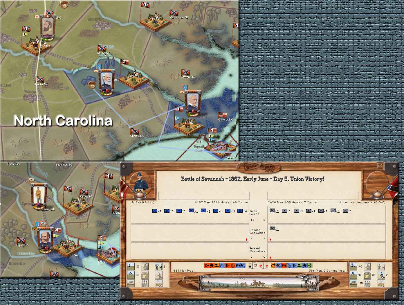 In South Carolina,USA Burnside's fleet sales out of Beaufort. This time the guns of Savannah find them and land 37 hits. Due to the large number of ships involved he emerges largely unscathed from this. Finding his adversary has slipped away, CSA's Jackson heads further south towards Savannah.