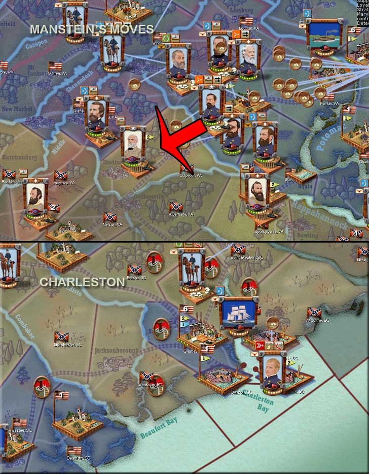 It is clear that Manstein will move on Charlottesville next turn. To fight another defensive battle in the entrenchments there, I will shift the entire ANV to the west. Longstreet by rail, and Jackson and Lee by foot as fast as possible. With luck, I can smash up some Union forces there, then shift back to Fredericksburg the turn after and do it again.