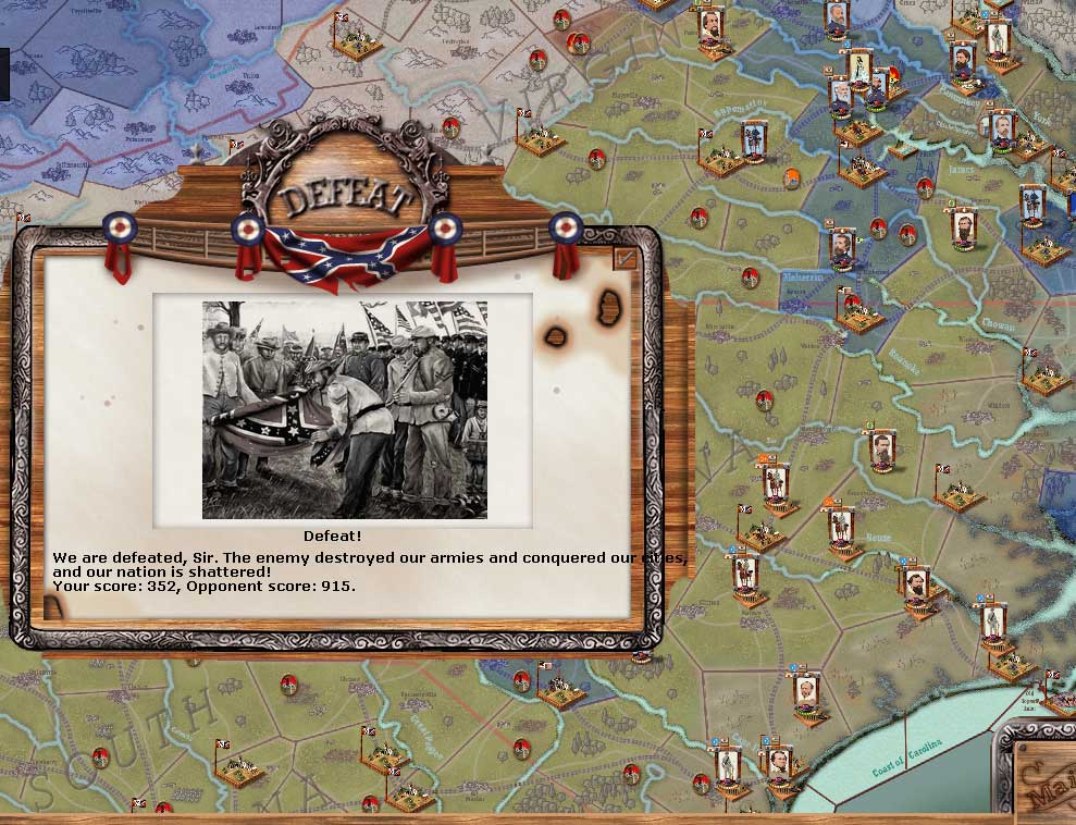 I think that the easter scenario is very unbalanced. If the federal player is aggressive, the CSA cannot maintain Richmond. I think (sorry by the designers) that the scenario is very bad done, about troops but about food too. Then, when I played against the IA (for know something the scenario, because out the championship I ever played the GC), I realized that the key was Richmond and only Richmond. If the federal player wants, Richmond will be conquered, then I when played as CSA, I left the rest of objective cities for defend only Richmond and I don´t know how, I had more divisions that you at Richmond front (12 full divisions), more a corps with 4 divisions for support 4 or 5 zones south, more 1 cav division defendinf the rail lines. When you tried advance to Richmond, I joined the 16 full divisions and I stopped your advance.
