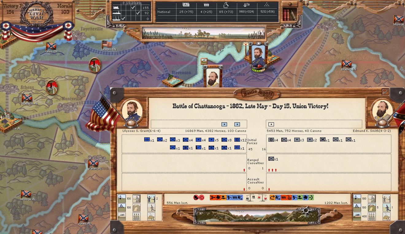Initially CSA cav elements isolate L. Rousseau's Corps in Knoxville by capturing Decatur. Thomas' folrces are dug in like an Alabama tick in mountainous territory, however. When the results come in it's somewhat of a foregone conclusion. CSA forces attack for two days and 10,000 casualties later give up the fight. Perhaps faulty intelligence or desperation led to the attack, or perhaps boredom on a quiet front.
