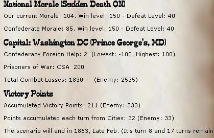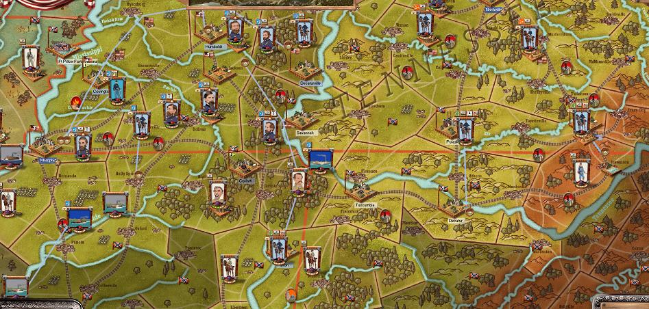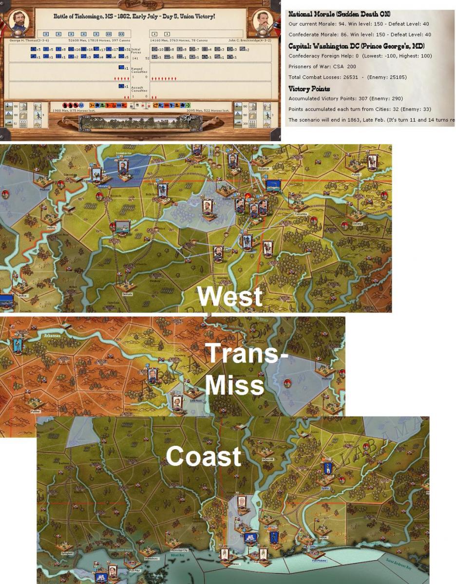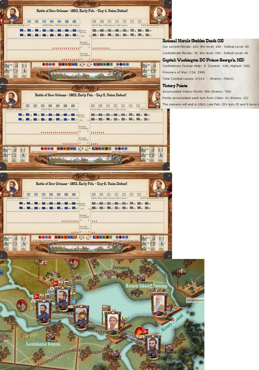 Frozen weather at turn one around Memphis told me there will be no rapid advance so I decided to strengthen up and move when weather improve. After battle of Corinth where Union army of 50000+ lost to CSA army of 25000 I decided not to waste time with well entrenched rebels and went for weakly defended Chattanooga. In the meantime Butler arrived at New Orleans which was defended by rather strong force under Polk. Landing there was out of the question so I decided to knock out forts first to get supplies, points and clear the way for navy than turn on Mobile. That drew Polks attention who left New Orleans practically undefended and Dodge with some 3500 troops seized the opportunity. From than on it was basically playing for points by holding objectives and strategic towns. At last couple of turns I managed to take Memphis and even capture Beauregard's HQ but Breckenridge escaped engagement twice.