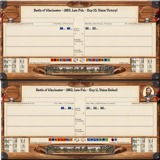 The primary battle this turn is at Winchester Virginia. Both sides send fairly large cav screens into that city. The turn ends with Runyan in possession, Jeb Stuart being the trump card. Manstein does, however, capture Manassis and Manassis Depot on day nine. Inexplicably Runyan failed to destroy it.
