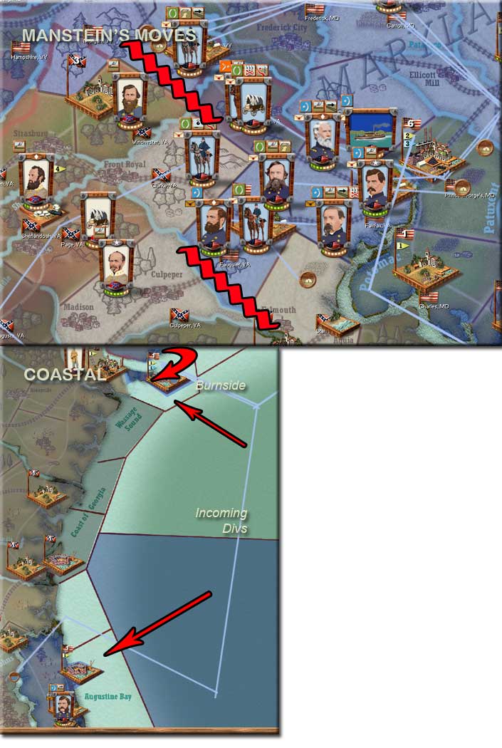 Having been checked at Winchester, Manstein assumes a defensive posture stretching from Harpers Ferry down to Stafford Virginia. He is gathering his forces. He is also sending two divisions down to the coastal region. Manstein sends Burnside to Fort Pulaski off Savannah, Georgia. He is bombarded, 32 points of damage.
