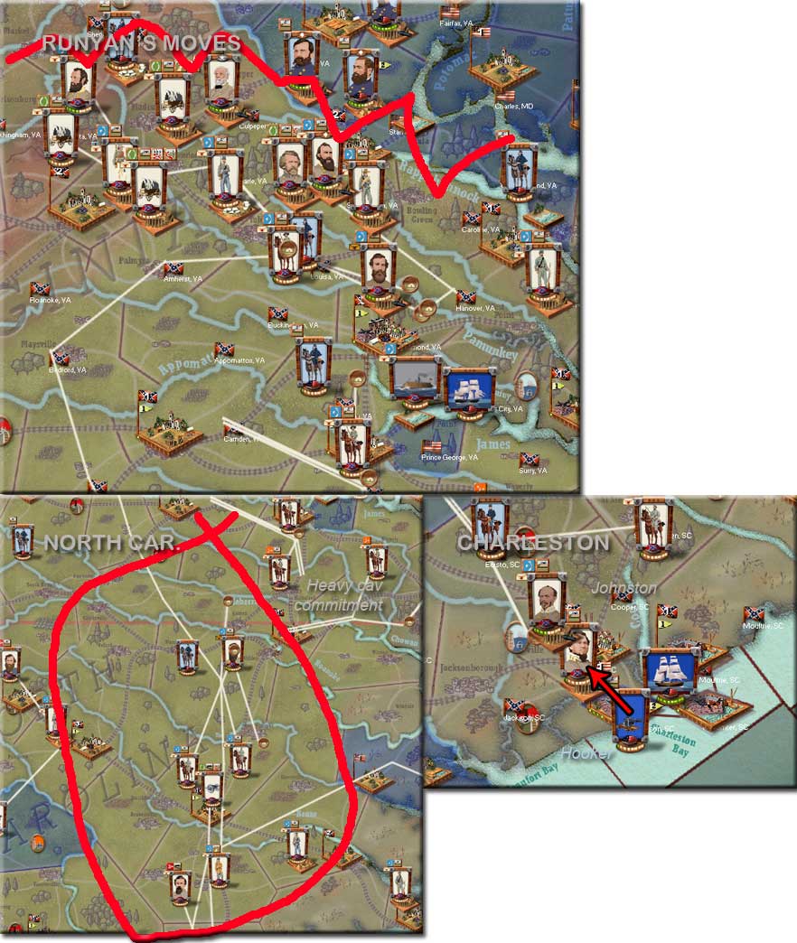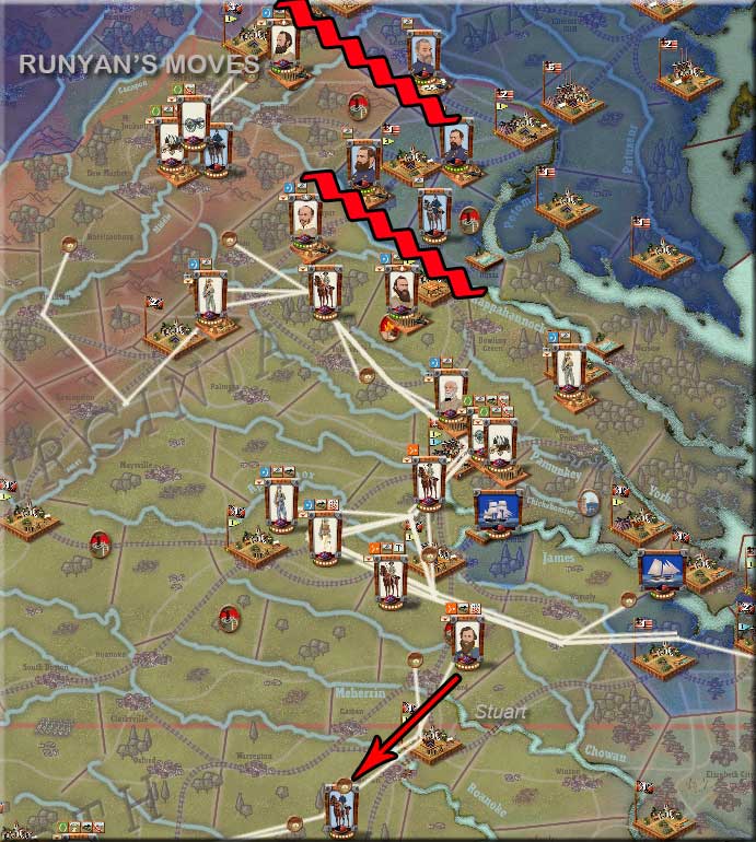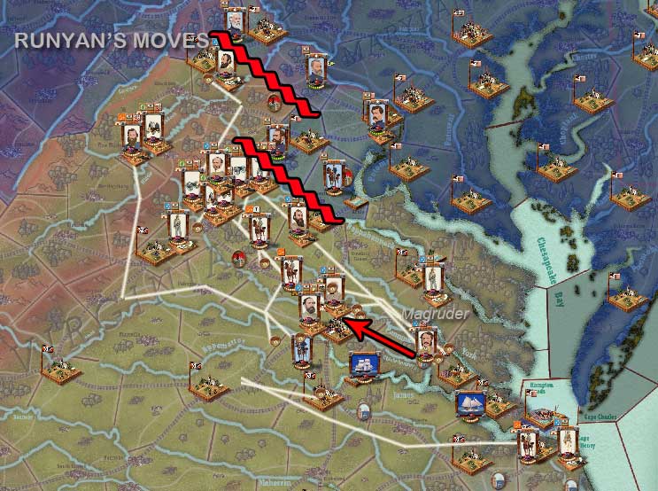 Runyan is sending Stonewall to reinforce Stuart at Winchester. He assumes a defensive posture in the other regions. He's gathering a reactionary force in North Carolina.