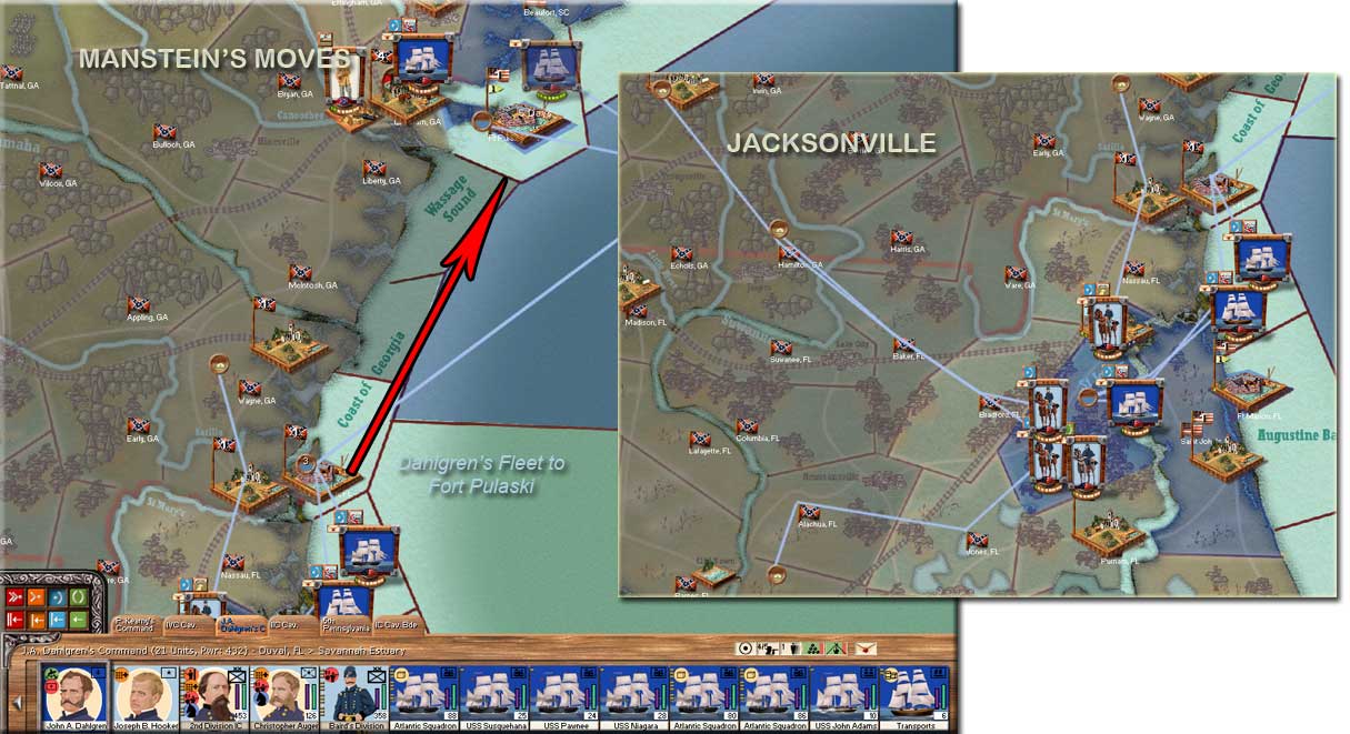 Manstein is also sending cav elements out from Jacksonville Florida to capture cities and villages in that area. Three Union divisions have boarded John Dahlgren's fleet at Jacksonville and are heading North to Fort Pulaski.
