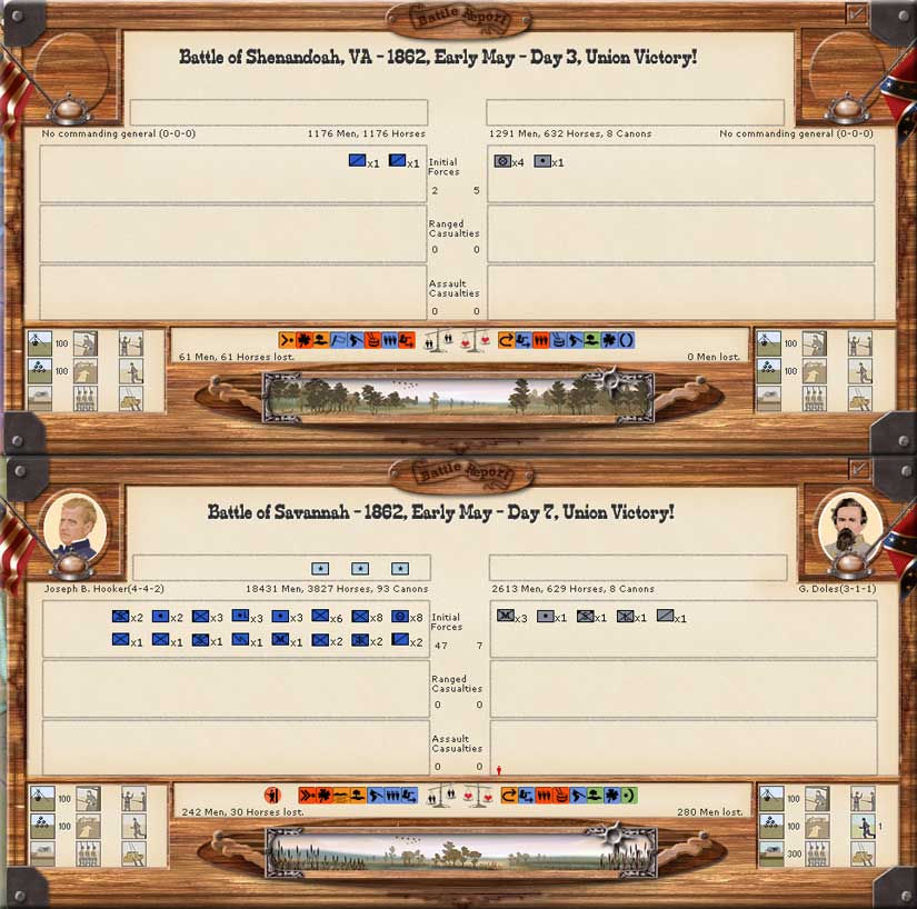 On day four Hooker arrives in Charleston and the two forces engage. The Union forces are fighting with a 10% penalty as Hooker is still only a one star general. Hooker's advancing lines are hammered by the Confederate artillery and one of his regiments is wiped out. Once within melee range he exchanges the favor and one of Johnston's militia regiments is destroyed. At the end of this day there is a draw, both sides bivouac for the tense evening.