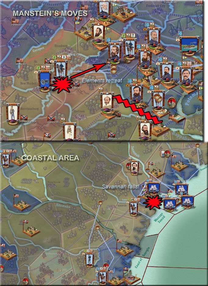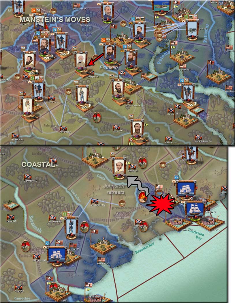 On the coast at Savannah Manstein has sent a militia element inland to wreak havoc. Jacksonville Florida, a strategic point, falls to Manstein, raising Union morale.