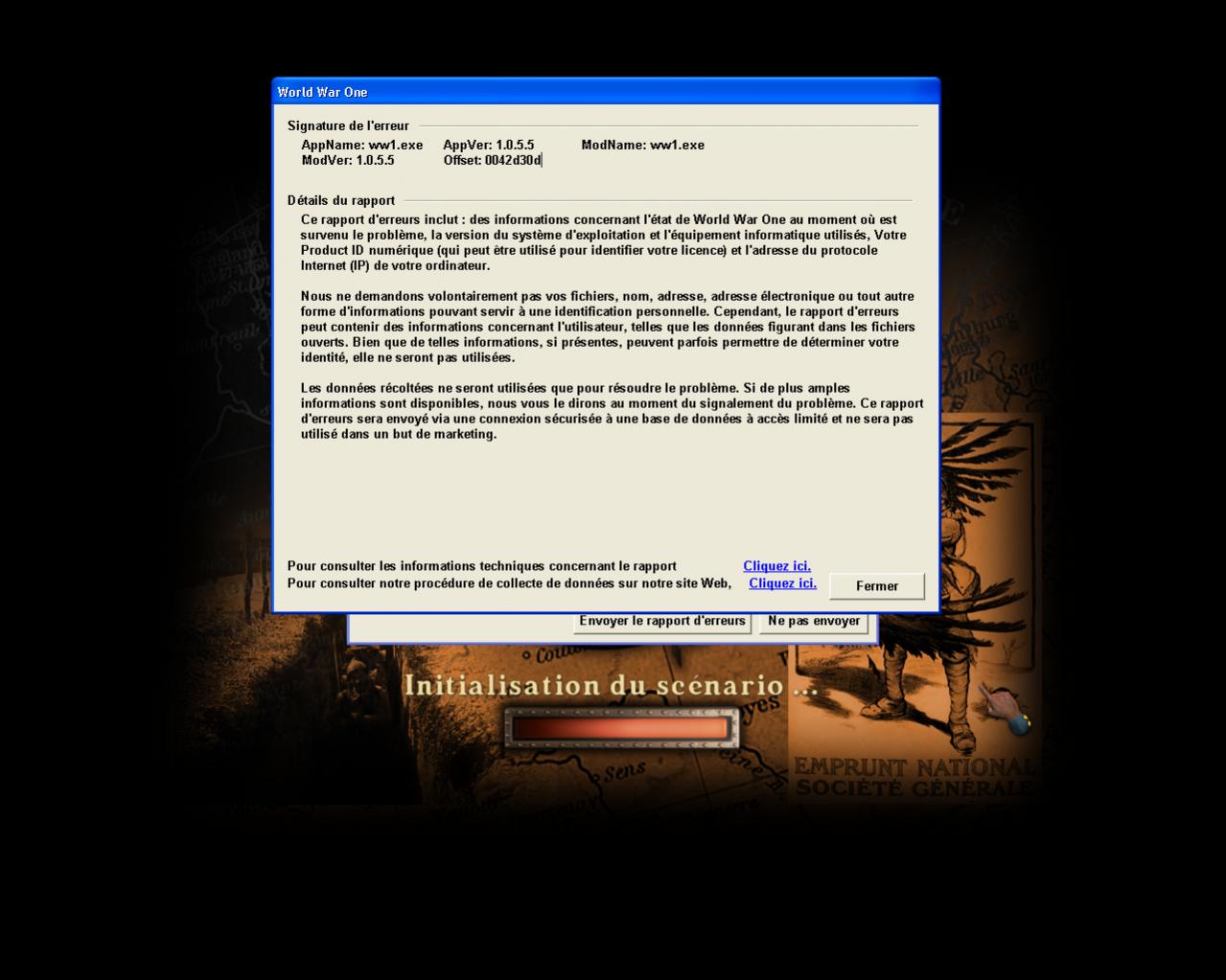 je viens juste de reinstaller wwi et patch 1.05f je lance le premier scenario et là crah windows. c'est la premiere fois que ça me le fait, du coup j'ai pas de sauvegarde a envoyer sur la copie d'ecran il y a le numero d'erreur windows si ça peut aider, mais je ne sais pas si j'y rejouerai, je suis un peu fatigué là... bon courage en tout cas.