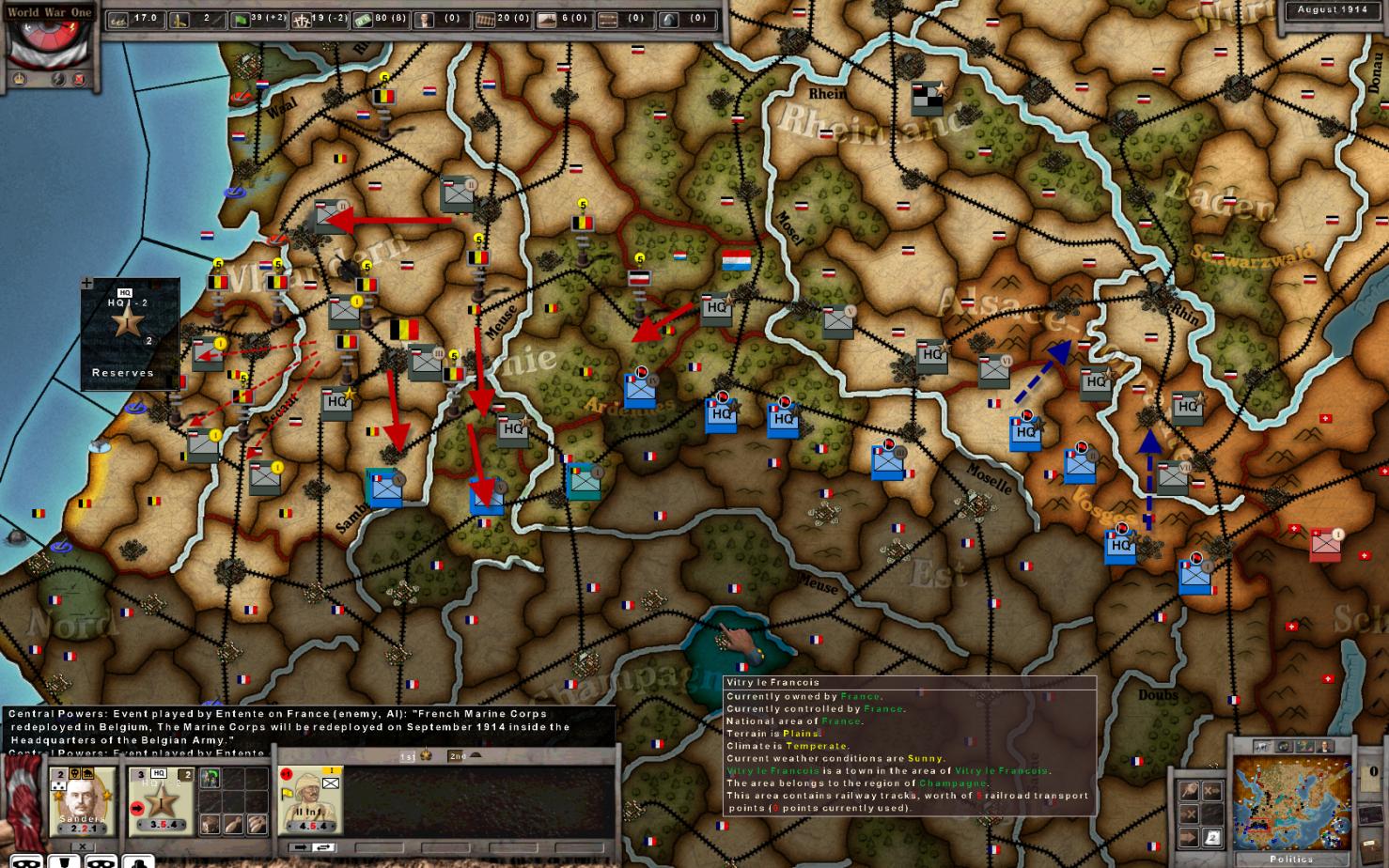 French AI does better this game trying to blunt the German right wing using the FR V Army and what's left of the Belgians. Brits should show up somewhere in September. Gap between GE IV and GE II in Belgium is wide and a concern, but French don't have anything to exploit with.