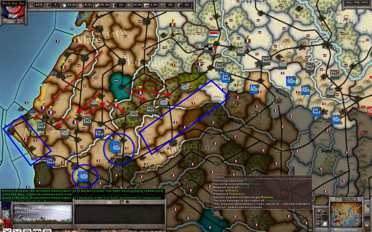 In the West, the Germans were not able to really break open the French line. The AI did a reasonable job of stopping me in 1914. However, the AI was not active at all, attacking weakly and not launching any grand offensive in the West at all. That continued even after I turned off all the fog of war in early 1915.