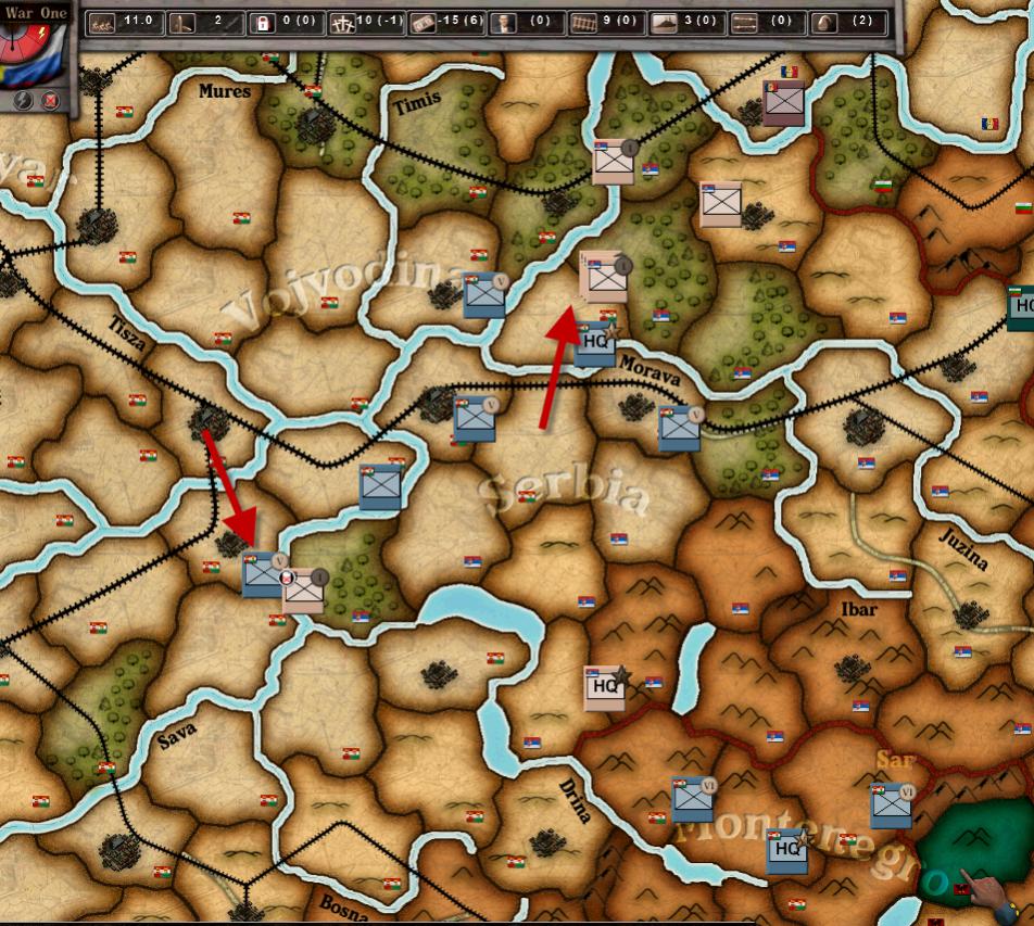 I played the AH very conservative, not attacking much in 1914, although they did have a large part of the line to hold in the East. Not having to also fight the Italians was a huge plus for the AH, and I only achieved that by just 1 diplomatic point (Italy went to -3 Diplo in May 1915, but in two diplo tests after that the Entente failed miserably and ended up moving Italy back toward the CP, somehow).