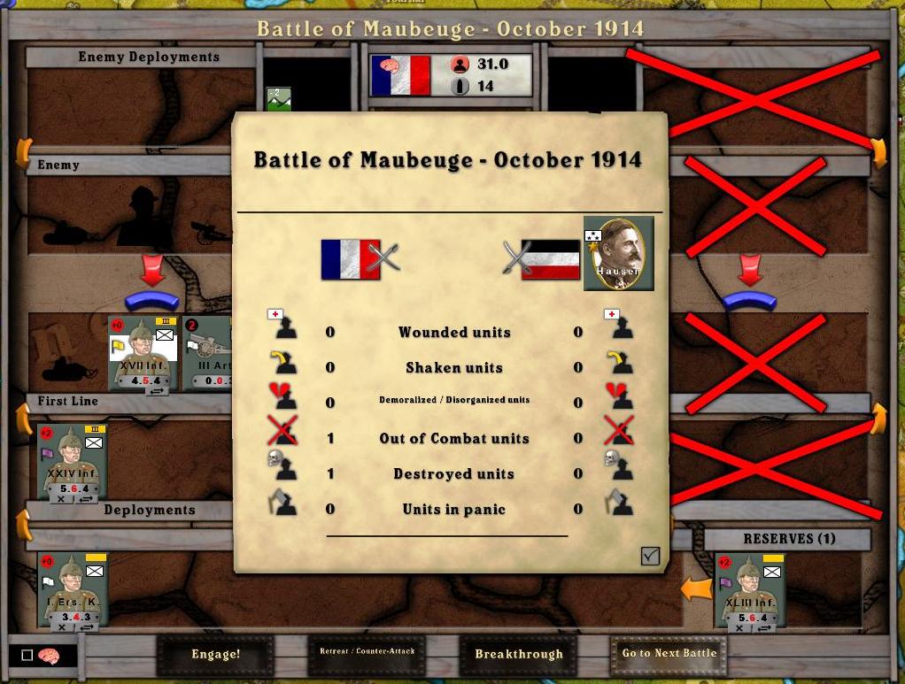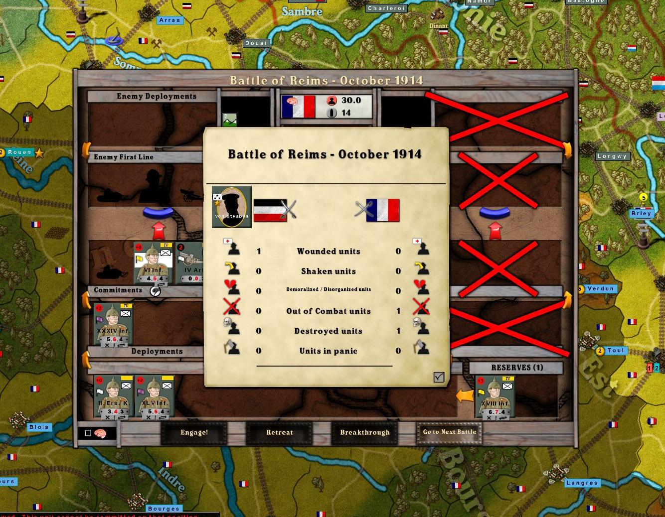 The 4th Army did very well in driving a significant French force out of Reims. Further, it broke through and crossed the Marne. This opens up the possibility of the 4th Army reaching Paris also next month. The 4th now has an issue of a possible exposed flank as the French were not driven out of Soissons. That task was assigned to the 3rd Army, but they never reached that objective.