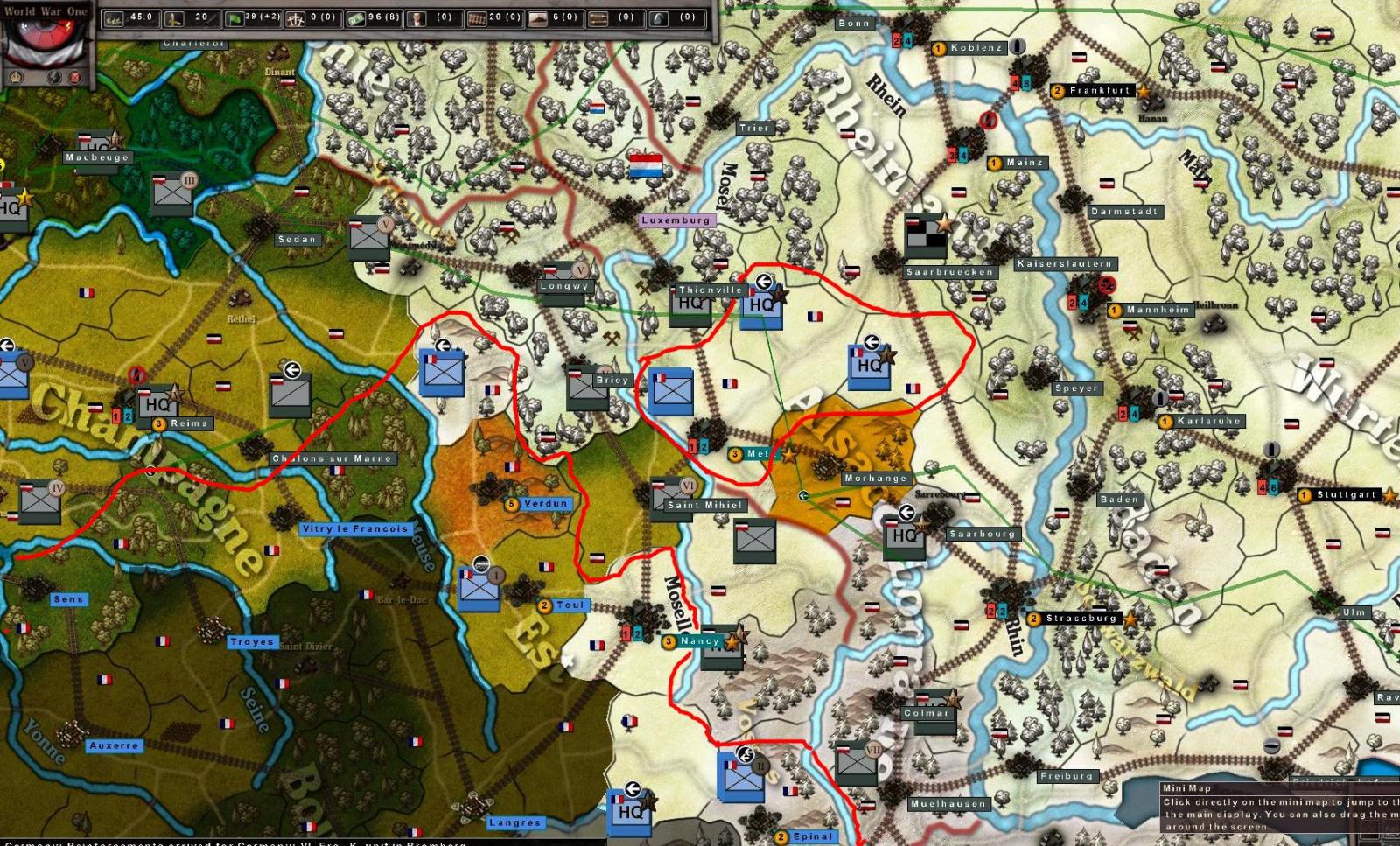 The 2nd and 3rd Armies had their advance cut short-the 3rd simply because it was attacked before it moved. the 1st, 4th, 5th and 6th Armies all achieved their objectives. This means that the French Army which had advanced and captured Metz is now surrounded. Before the AI realized it was going to be surrounded, it continued its advance into the Rhineland. There was some hope that would not occur, as it has made a mess of the front in that area. However, the end result should be the anihilation of all Frech forces on German soil. (well, if you are French, you might consider it French soil :) )