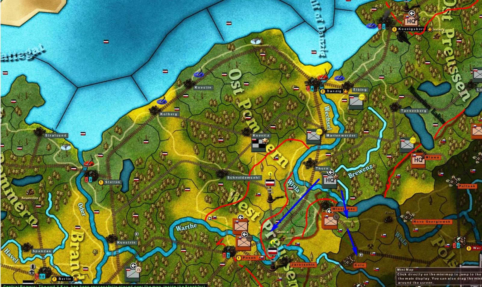 There were only two offensive moves ordered; one by the 1st Army to capture Rzin and by the 4th Army-basically securing the front to its right flank. The first Army was also tasked with expanding its bridgehead across the Wisla by sending one weak Inf corp north and a Cav corp to the south. There is no Russian resistance expected in those areas.