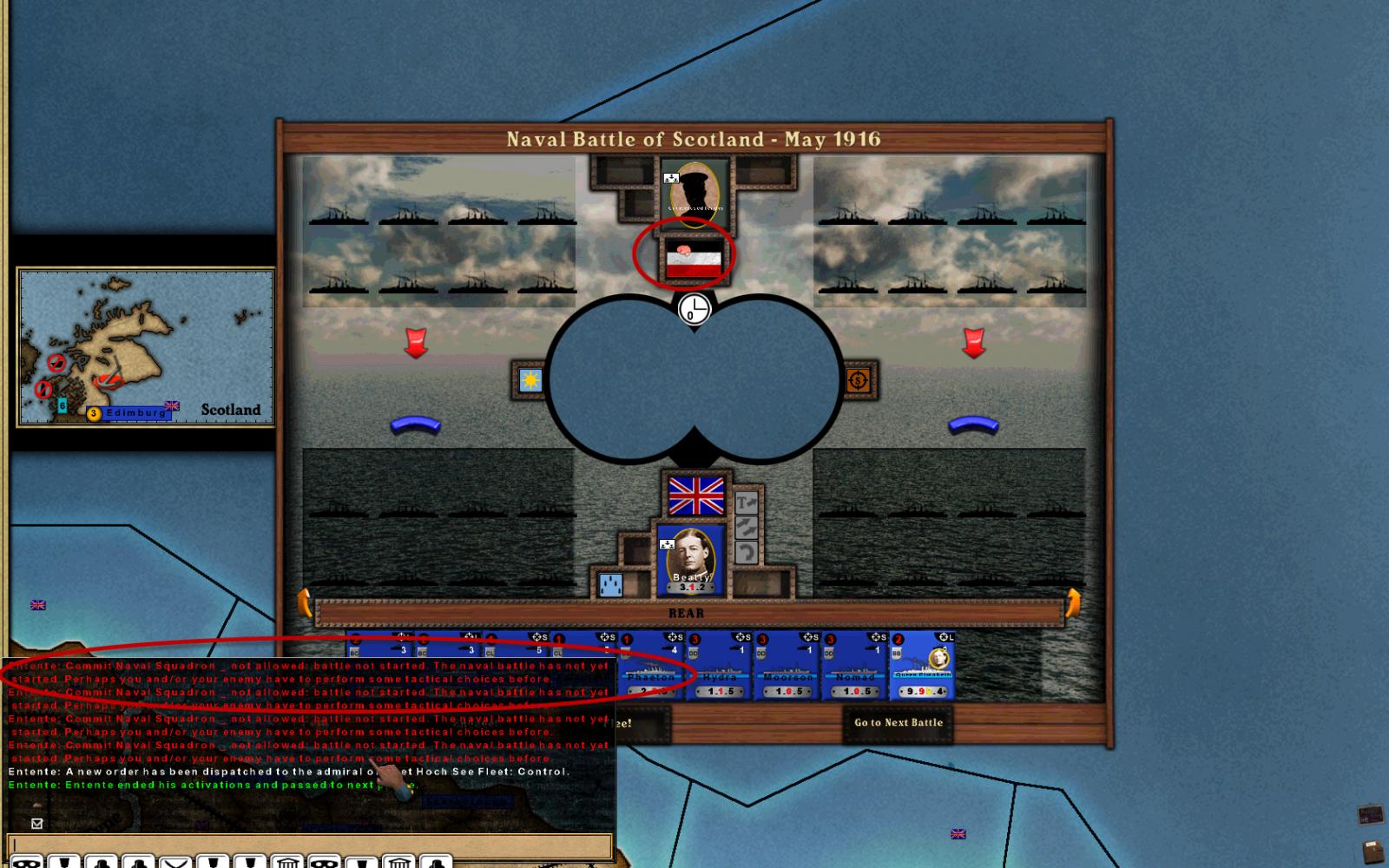 See attached screenshot. The Hoch See fleet came out on a control mission in May 1916, but the game would not make some choice required of the German side, so the naval battle would not start. I had to ctrl-alt-del to get out of the game. Very frustrating. :(