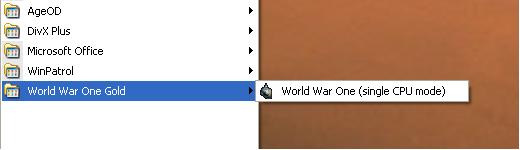 The shortcut to the single cpu batch is created in a new start menu submenu (World War One > World War One (single CPU mode)), different from the World War one menu (which, in my case is a submenu of an "Ageod" entry. At least in my 2 PCs, where I have WW1, gold and patch installed, in that order (see attached pic).