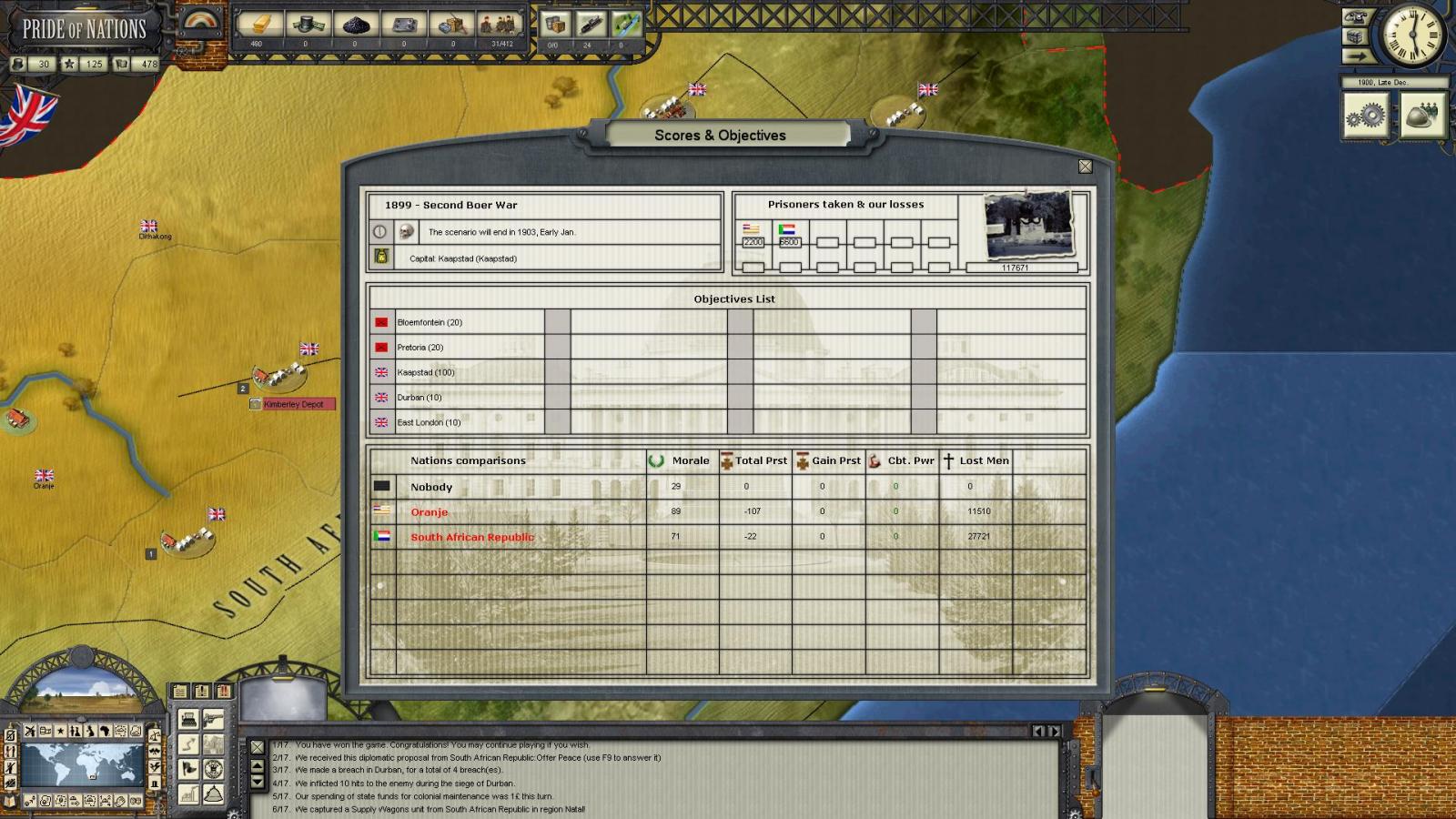 Franciscus wrote:I must say I do not understand your experience with this scenario. I just finished it, and won easily playing the Brits. Surely I lost a few batles, but in the end my numbers were obviously overwhelming. Also, I did not experience the absurd losses in specific battles you guys report - although there were a couple of battles with 100% casualties (which is almost never realistic), and I lost globally more men than the Boers (see pic - this in December 1900, after prolonging the game until every Boer army was wiped out. Brits ~ 120.000 losses, Boers ~ 45.000, including prisioners).