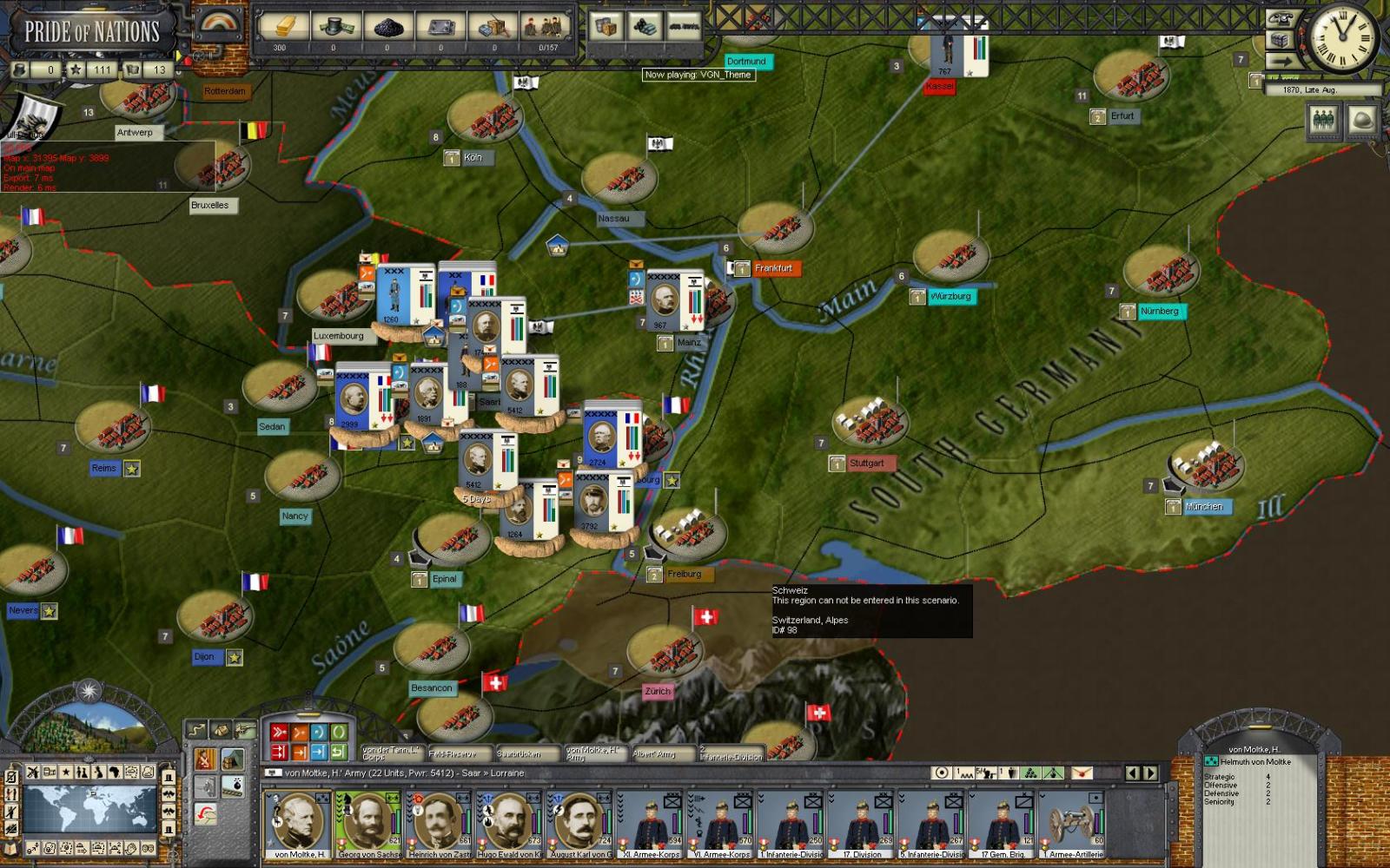 I reorganise Saarland German troops. All corps commanders but Von der Thann join Moltke, who gets other armies artillery too. The Prussian Schwerpunkt, und Moltke, now amounts to 5412 and will enter Lorraine in 5 days. He’ll confront main French army, under Bazaine, 2999 only. Bazaine incompetence, Prussian numbers and offensive qualities of corps leaders should guarantee a victory, or at least even losses.