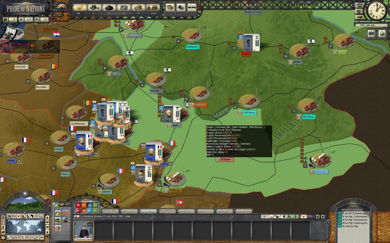 In rear, new reinforcements arrived, Von Bonin corps will be in Saar in 11 days. Manteuffel will arrive in Pfalz in 2 weeks, certainly needing half a month to recover cohesion. In absence of new forces unlocked (some battles and victories will be needed, 2d infantry division is redeployed into Saar.