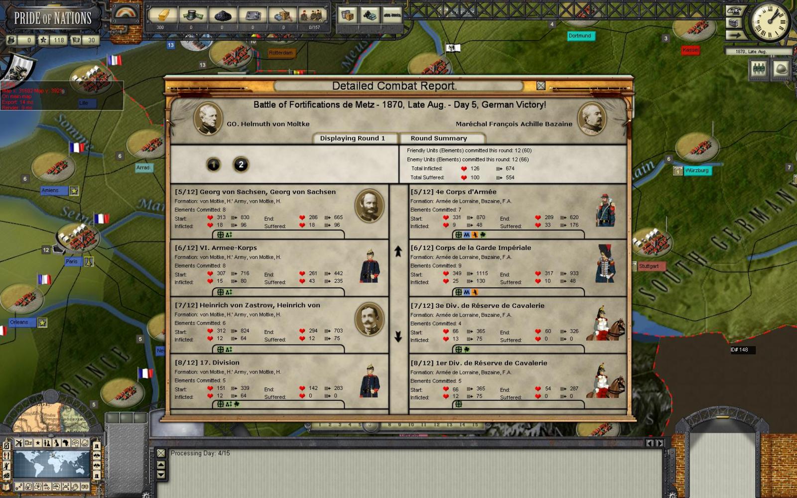 Amazing – Wunderbar ! – the French made a stand and fought everywhere – and they were duly crushed. Bazaine army, badly mauled by Von Moltke, is back to strength inferior to 2000. Mac Macon army beaten in Alsace, retreated to Saar, where she was routed by Von der Thann, and routed again by Friedrich-Karl. Und post vernichtet ! dasz ist die groszte Preussige Sieg since Waterloo. Hurrah fur der König ! Nach Paris !