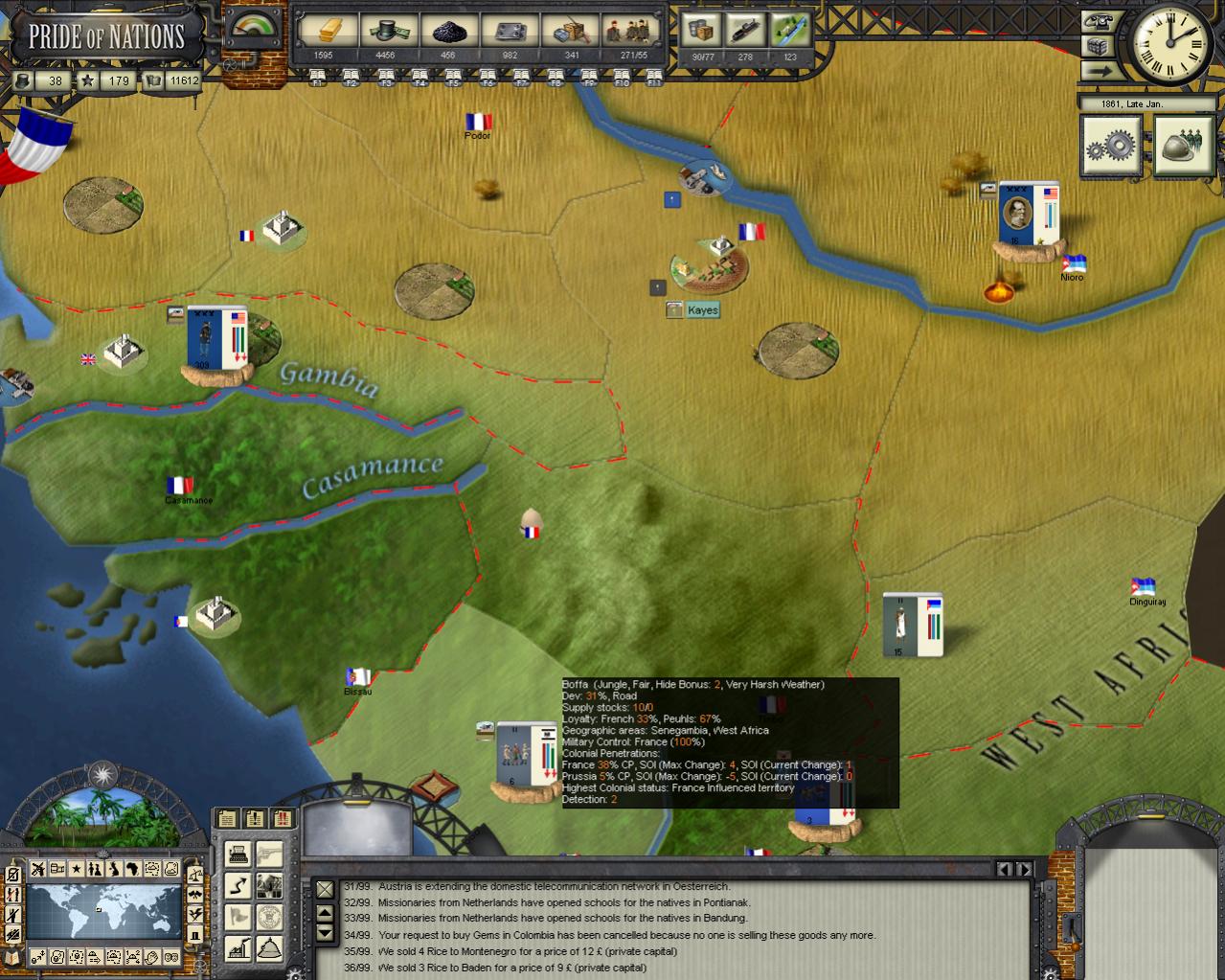 So 1859 hit and I was looking forward to having a nice little war with the Austrians. Unfortunately, it didn't get triggered. Sardinia-Piedmont had the mobilization event but nothing else happened. After many months of this, I decided to just invade S-P myself to grab Nice and Savoie. Savoie needed a WarScore of 170, completely conquering S-P was worth 118, but it became possible to ask for Savoie after full occupation occurred. It was never possible to ask for Nice since it is not a claimed area -- maybe if that 10% rebel loyalty was French loyalty that would have been possible.