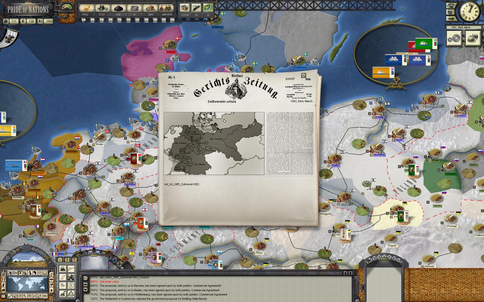 [ATTACH]21253[/ATTACH]I'm playing through a grand campaign as prussia, and found this bug. I am playing 1.03D QF. There is opt_notify_GER_Zerverein1852_Choice1 in the game log, and the newspaper has not text. Attached is screen shot. Should there be text for this?