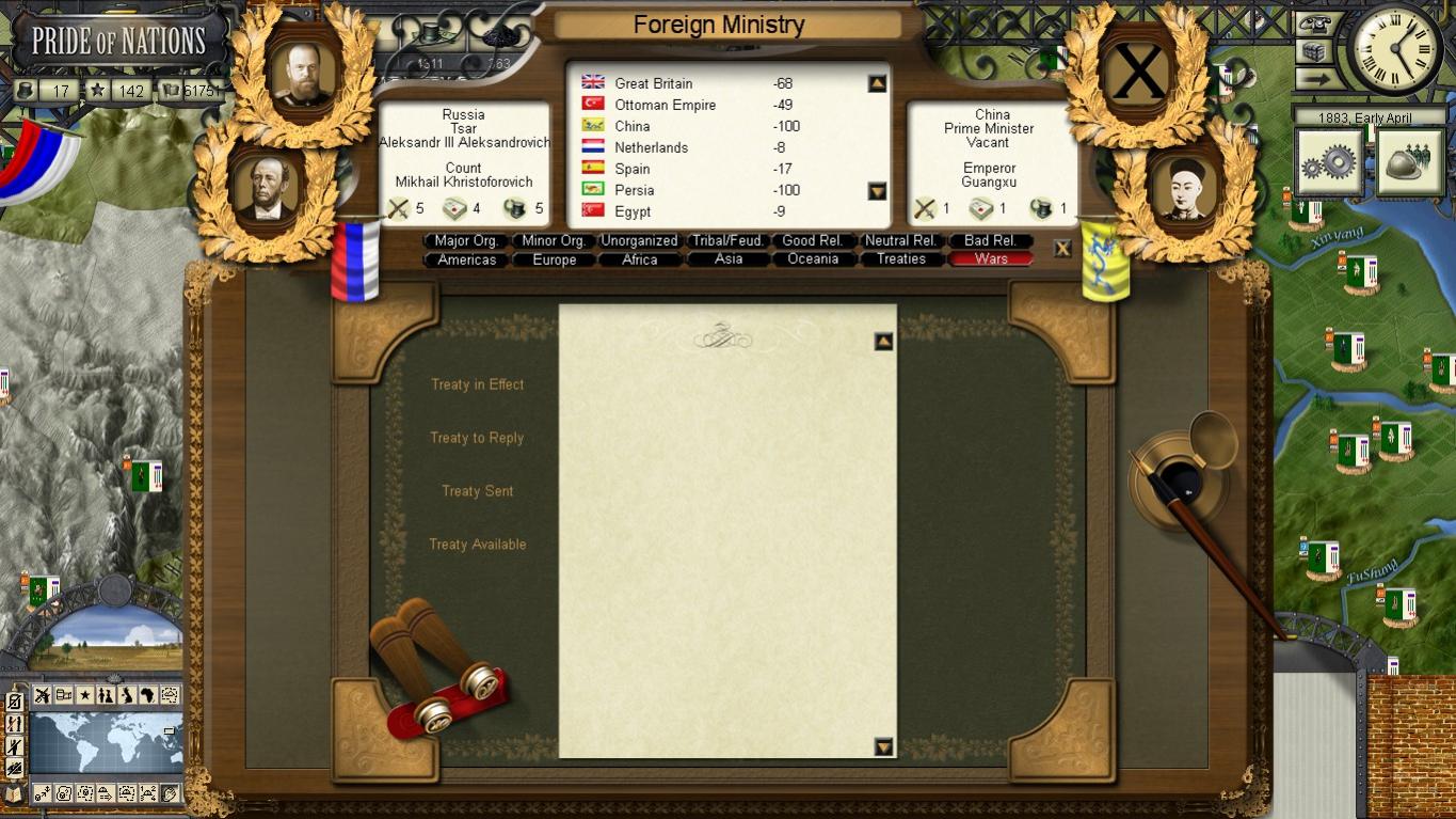 after years of crushing reviolts and training officers (had the best officers in the world then, but they kept retiring so had to train new ones with victories), I goçt tired of it, but no peace, so when a Chinese governement sent me (again activity) a Sin kiang transfer peace, i accepted THEN