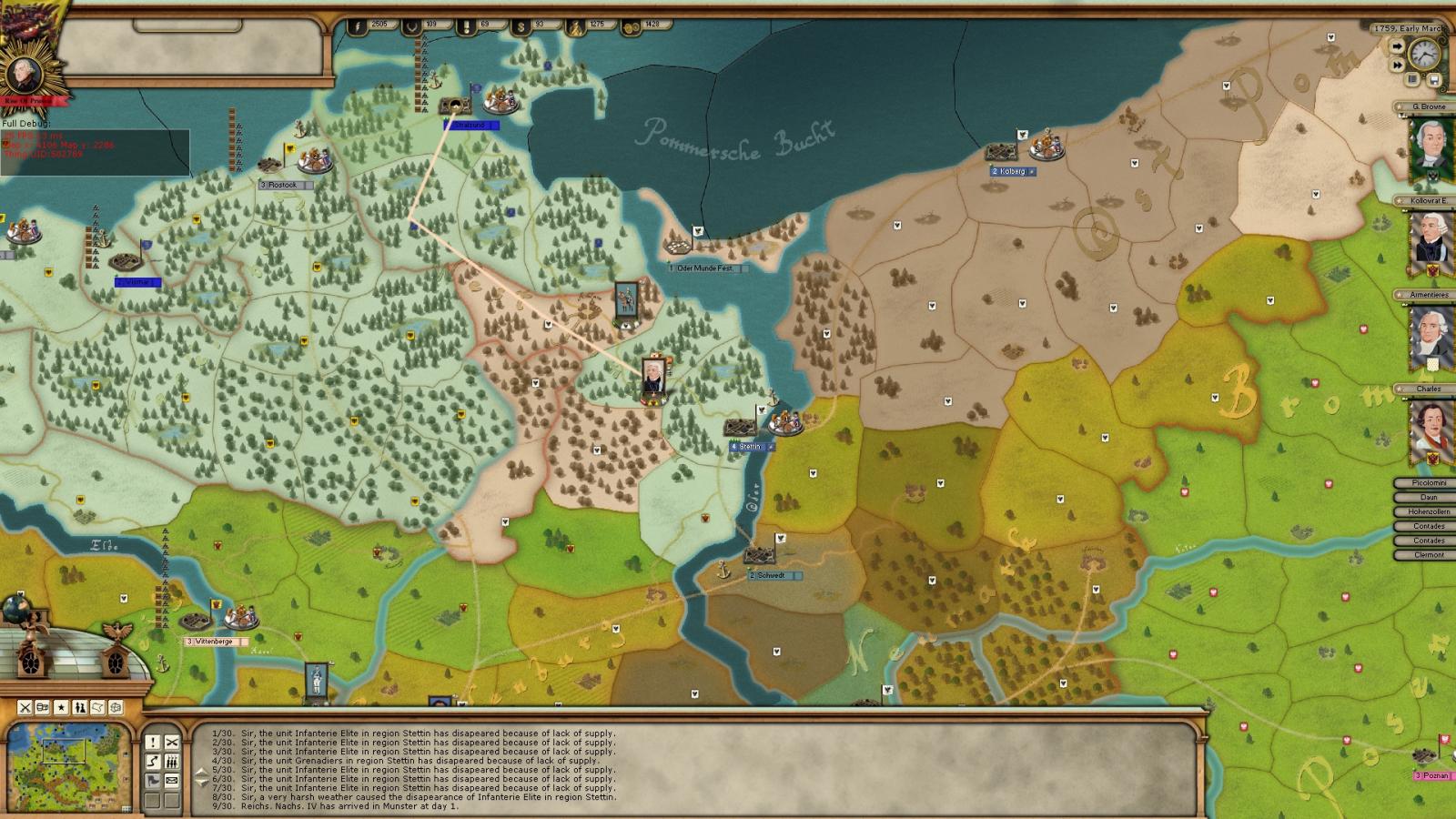 organization(CP) and supply of troops generally are just fine. In other and in many examples in mainland when AI was out of supply while sieging, another force with supply wagon comes just in time. But this example is different. When Austrian force started to march Stettin I was mostly sure they will got out of supply because of the distance of places in case of out of supply.. In other siege of Stettin AI was able to retreat without losing troops but it is risky to siege Stettin like Kolberg , Bremen vs.. Reason is the distance. Even correct desicions made it is very risky to siege those for the ai.