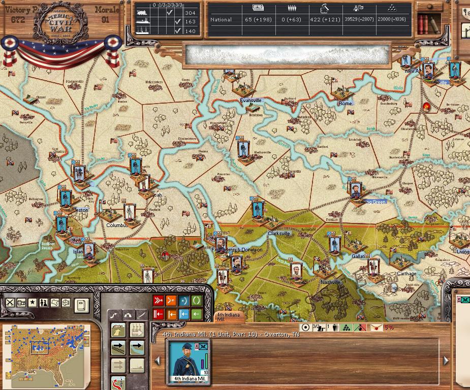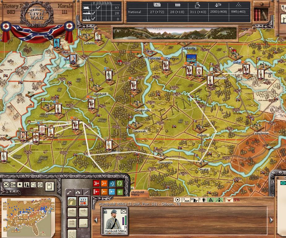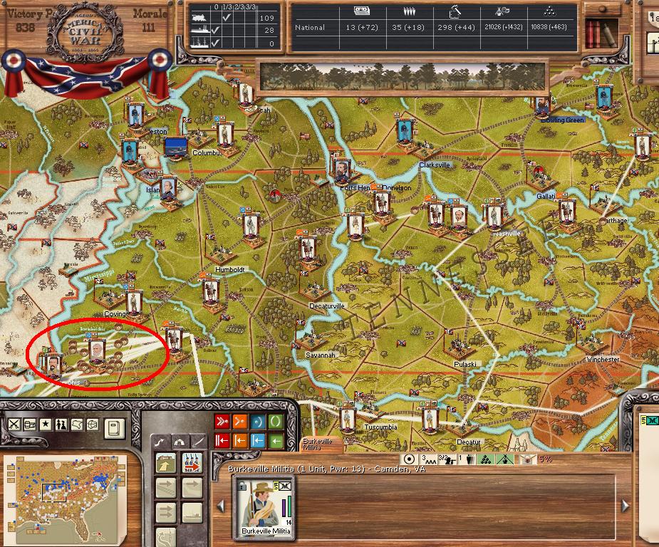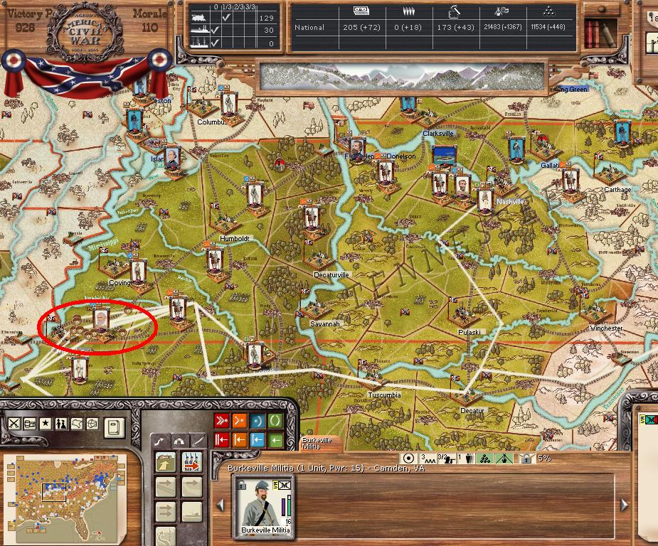 Orders - Joe Johnston + 4 divisions are moving by rail with orders to assault Norfolk this turn. The AOM is formed in NO by AS Johnston. Manstein sends more reinforcements to Memphis. Due to the large movements by rail this turn, Manstein orders construction of 100 locomotives.
