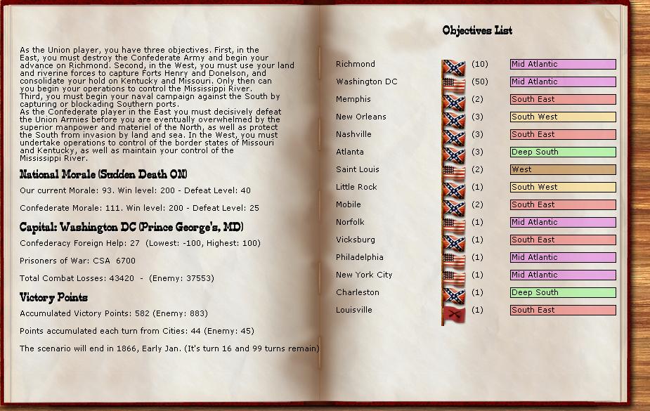 As we come to the end of 1861, we can reflect on the carnage. Manstein is up 235 points (on this half of the campaign), as well as 15 NM points. FI sits at 40 (not a bad number for the end of 1861). There have been over 98,000 combat losses. The union has managed to capture Norfolk, but not much else, and has had an army (trapped around Richmond) and a command of 12,000 (river assaulting Memphis) destroyed during combat. The confederates have almost as many losses (not a good sign), without any major disasters. NM has see-sawed up and down during the course of the campaign. A new year beckons the combatants to more bloodshed, as neither side wants to concede defeat.