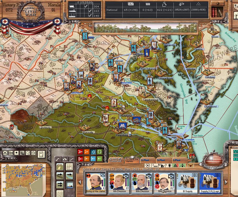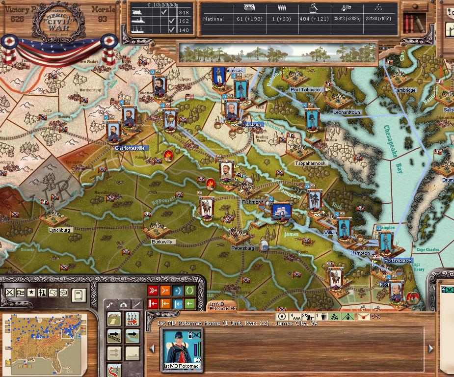 There were 2 major and 1 minor battles this turn. Both major battles occurred in Norfolk VA. As a result, the confederates lost approximately 12,000 men (including the retreat hits). The union lost only 6,300 men. A very bloody 2 day battle, which the south can not afford for long. The confederates went from fewer casualties to almost even this turn.