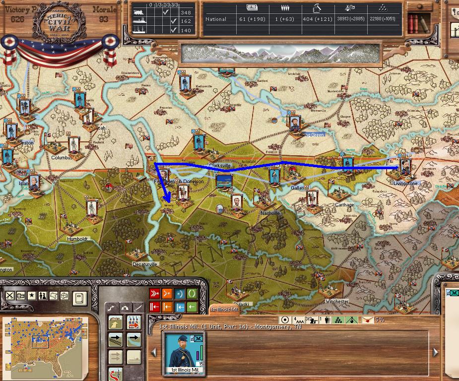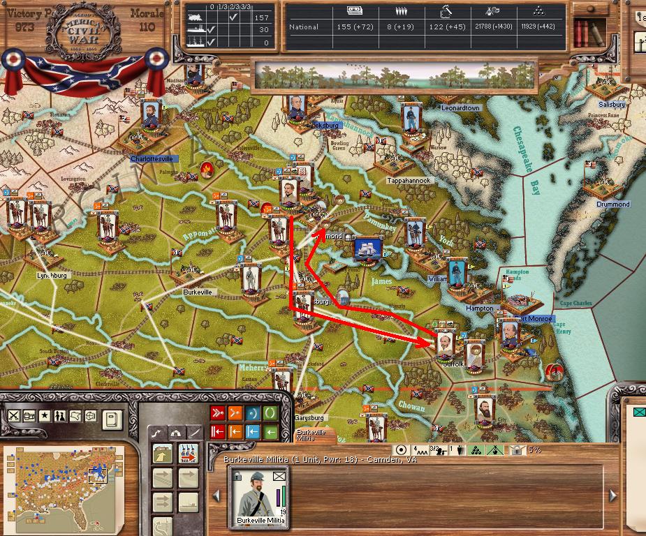 Orders - Hooker + division to Norfolk by sea. Butler currently holds Norfolk with an entrenchment level of 3. L Wallace is moving to Humphreys TN.