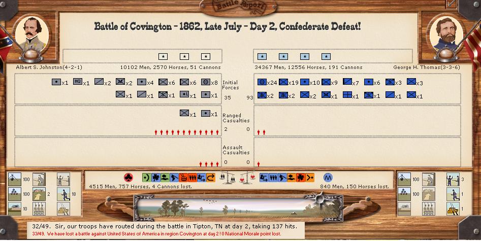 Well I was able to capture Chattanooga (it was not really defended). I was also able to attack and destroy 3 of his ships by New Orleans. There were 3 small battles, and I was able to hold New Orleans against the counterattack from AS Johnston.