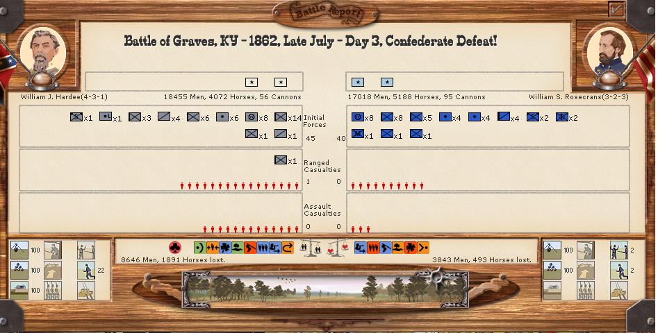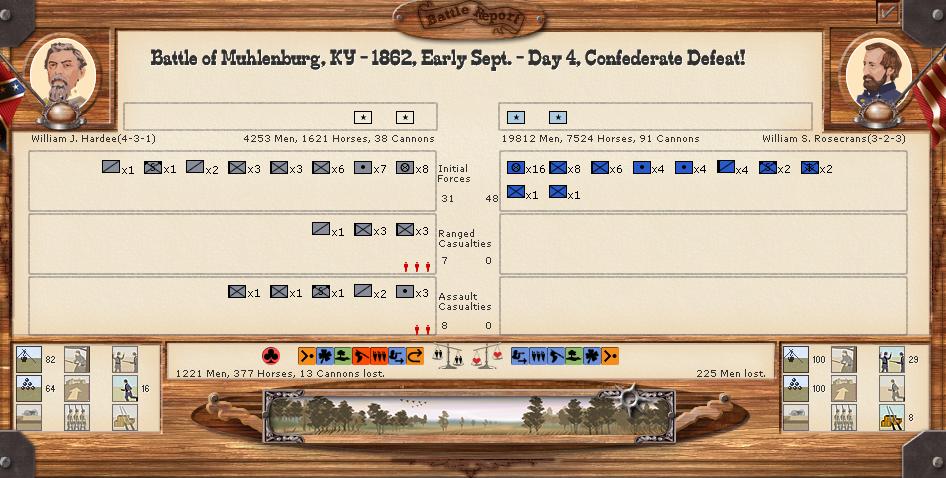 Complete disaster for me. I can only slow down his advance. There were 7 minor battles. Hardee is still trapped, and Vicksburg will fall soon enough.
