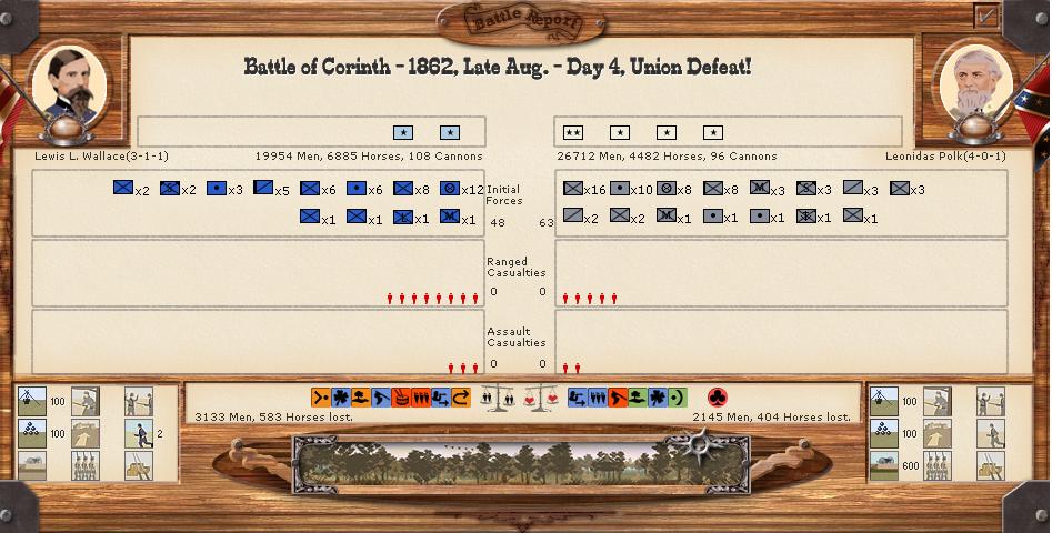 I have lost Memphis (it is a see-saw battle here). Manstein moved Bragg's Corps into Memphis, but was able to keep the trenches up by moving another Corps into it. I attempted to attack Corinth. My generals retreated before battle however.