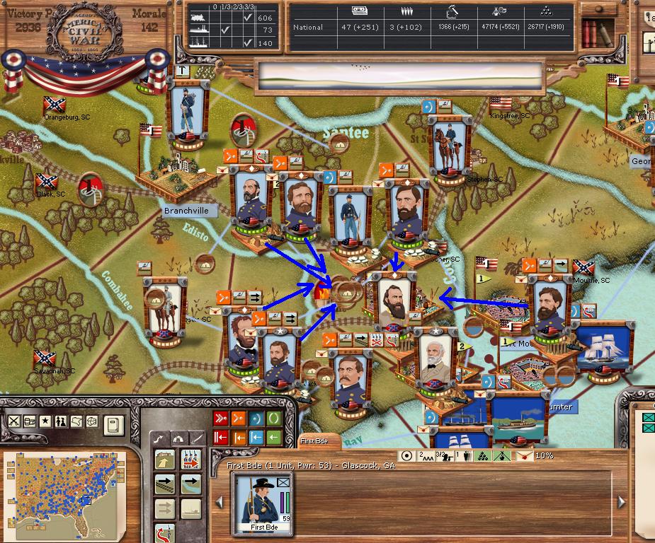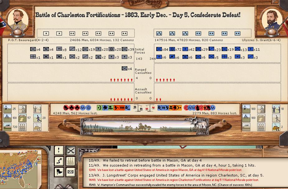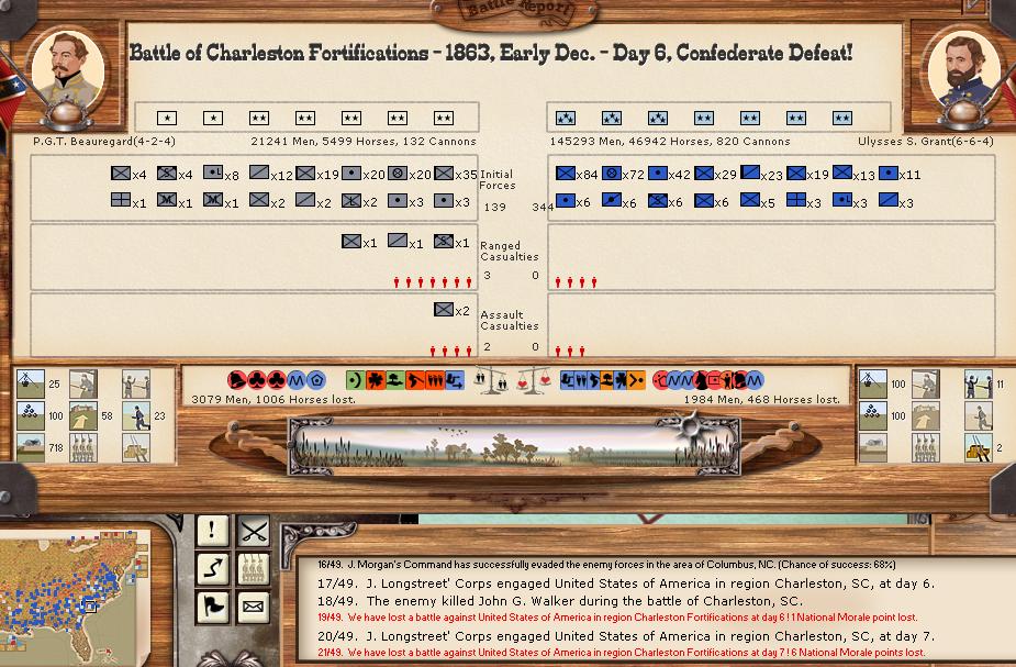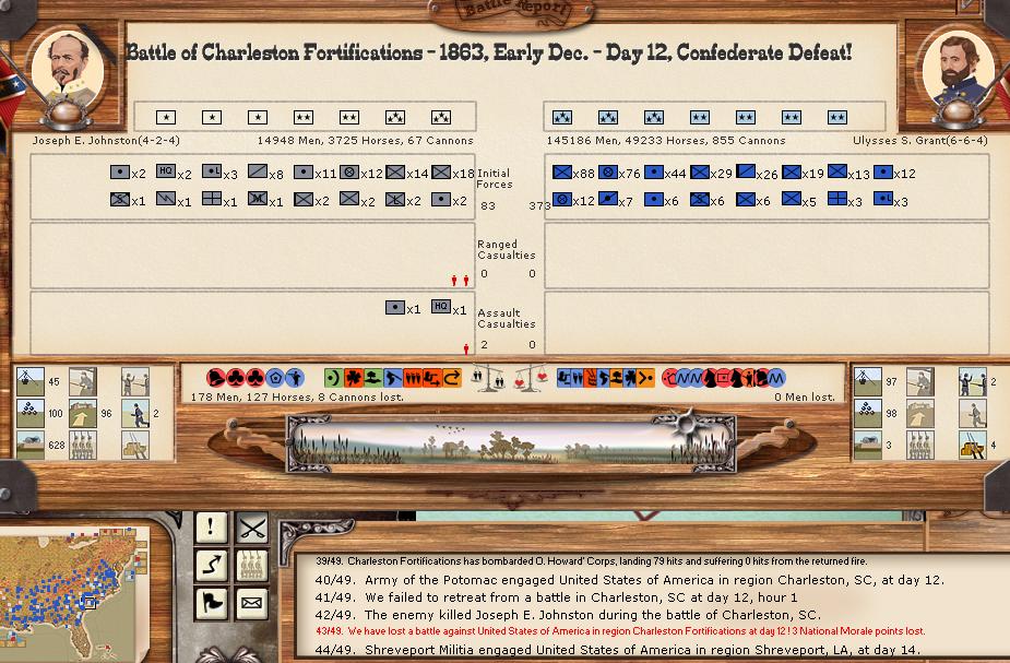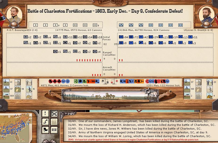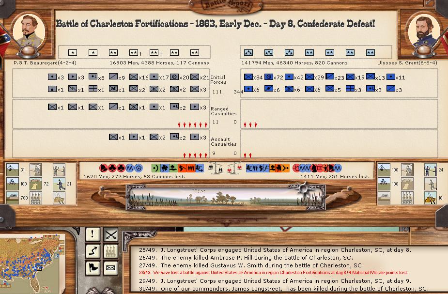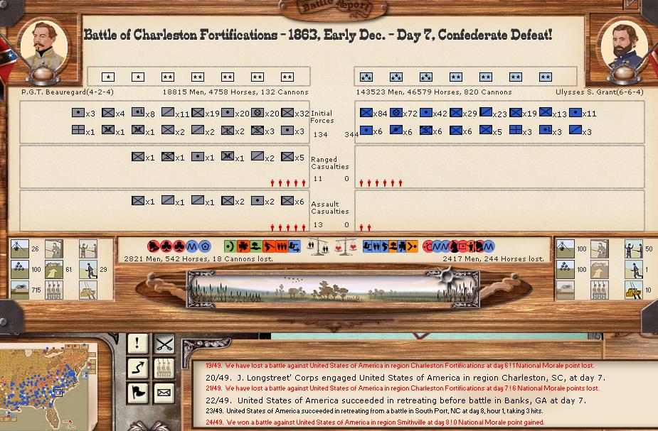 My what a bloody turn. There were 3 minor battles, and 6 major battles. The union bombarded the CSA for 34-0 hits. Charleston/Ft. Johnson bombarded the union for 192-5 hits (ouch). There was 1 minor naval battle.