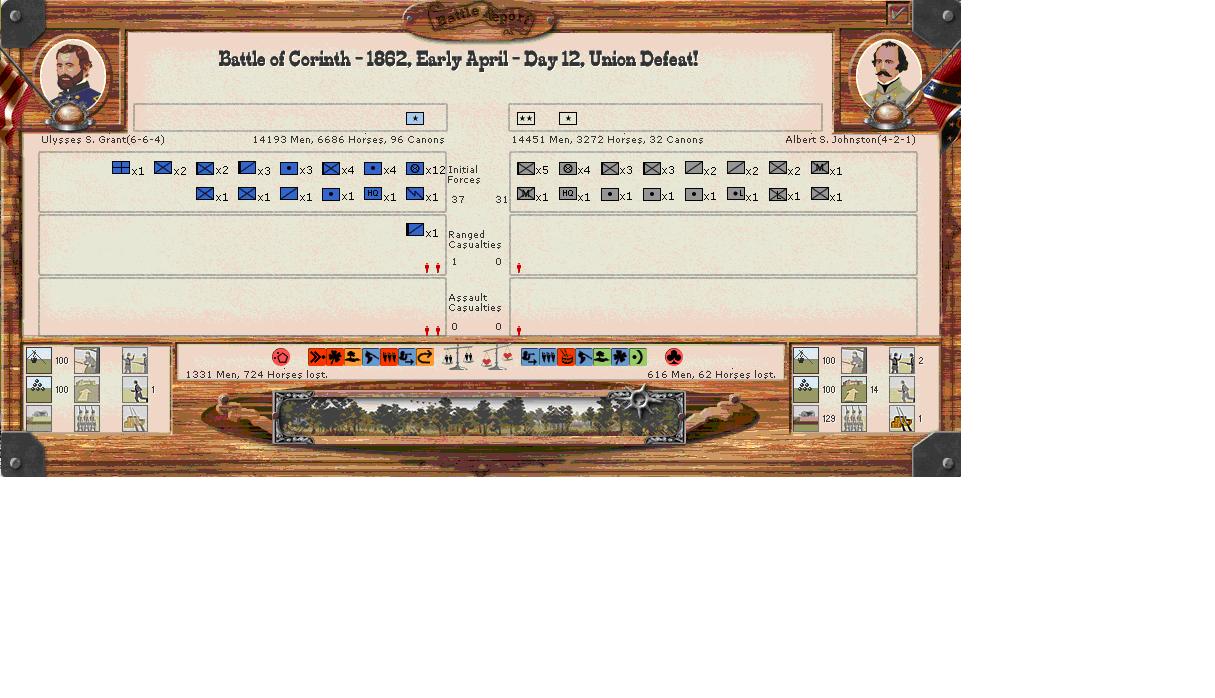 Interesting battle at Decaturville, Dodge calls for reinforcement and in the process, a smallish Union victory that costs Polk 1,000 due to 40hits during retreat. Polk retreats back to the main force just north of Corinth.