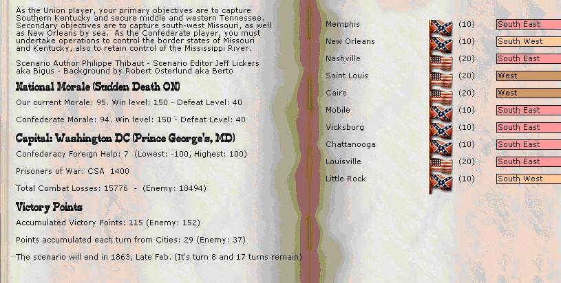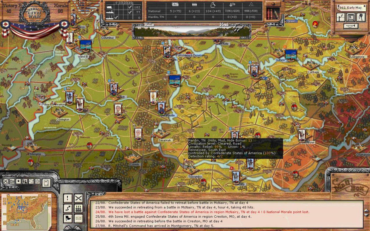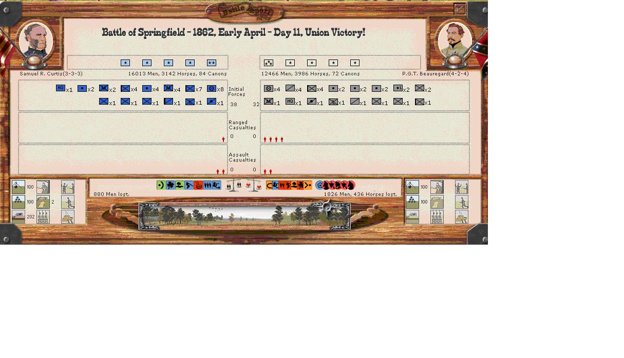 Pope is inactive but Rosecrans is active and will assault Island10. The rebel force shows as combat strength 58 after suffering 10hits, so we face probably 1/2 regiments and an arty battery. We will thereby open up the Mississippi and threaten Memphis if all goes well.