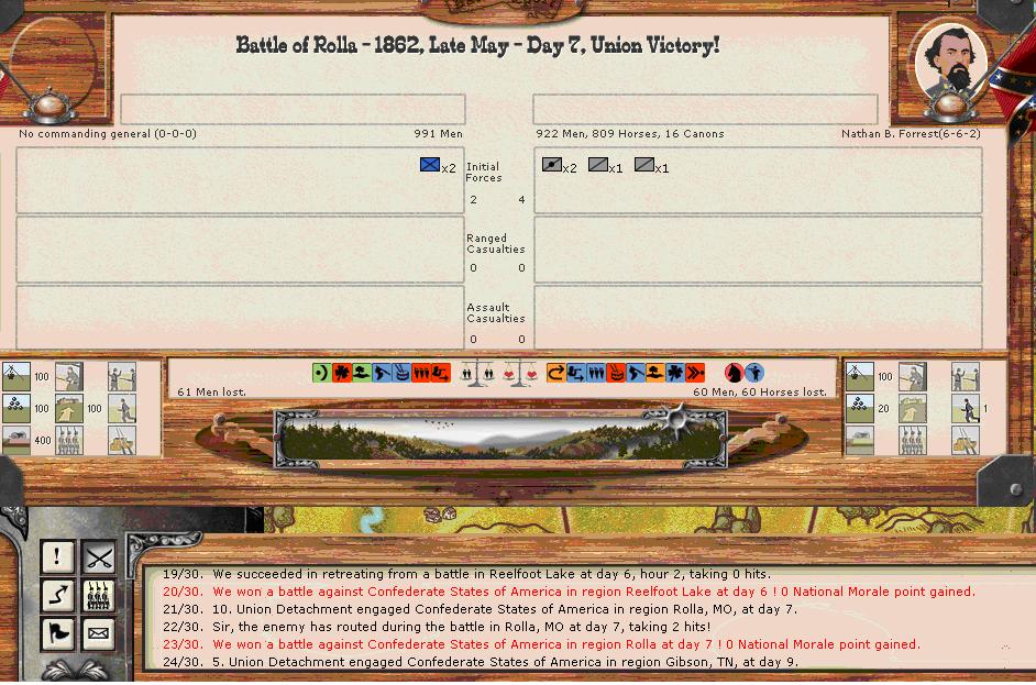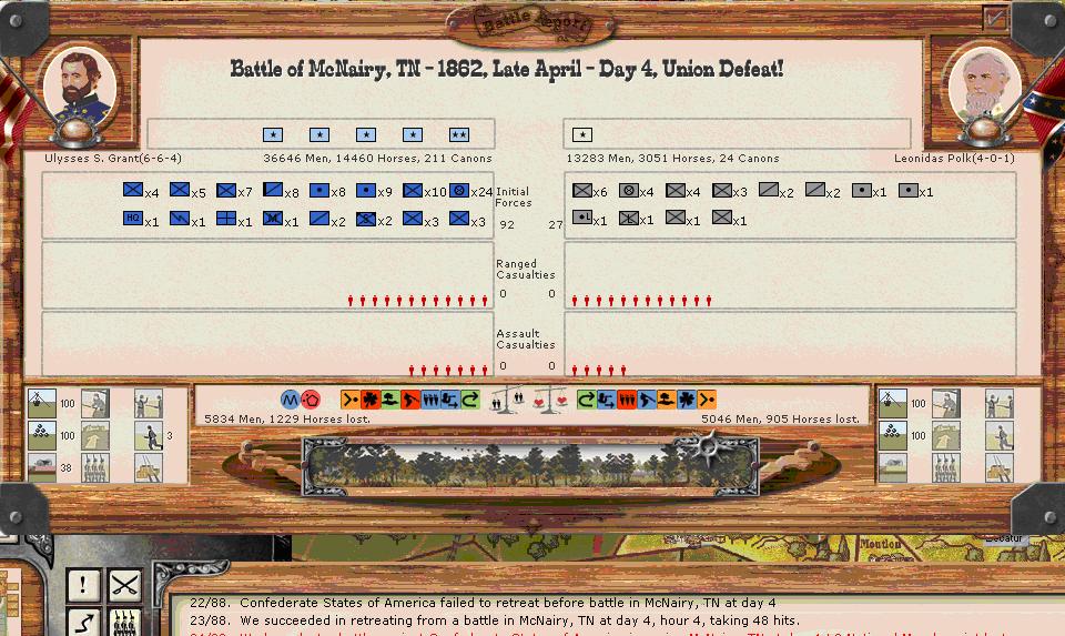 Grant retreats(his force is intact and with full cohesion) it appears and Thomas cant fight off Polk?? Doh! 7000 men(including retreat hits) lost vs. 5000CSA and another retreat.