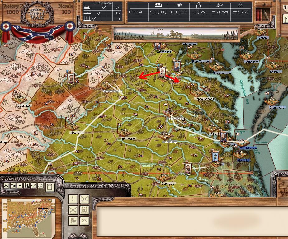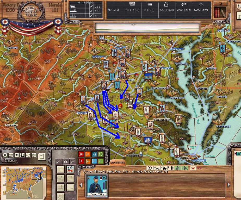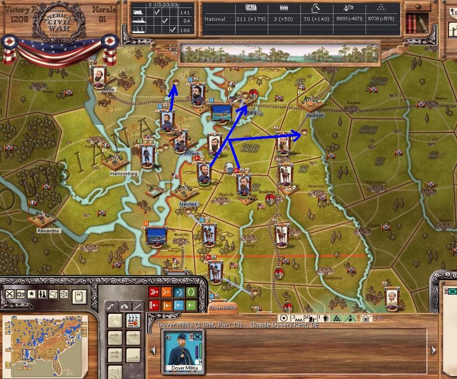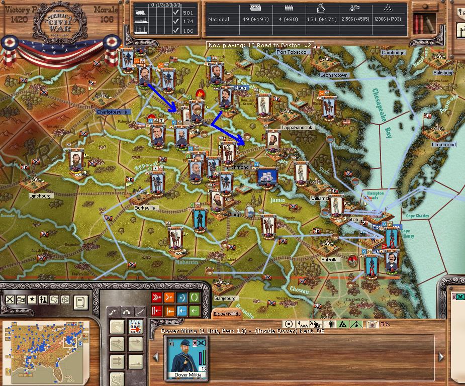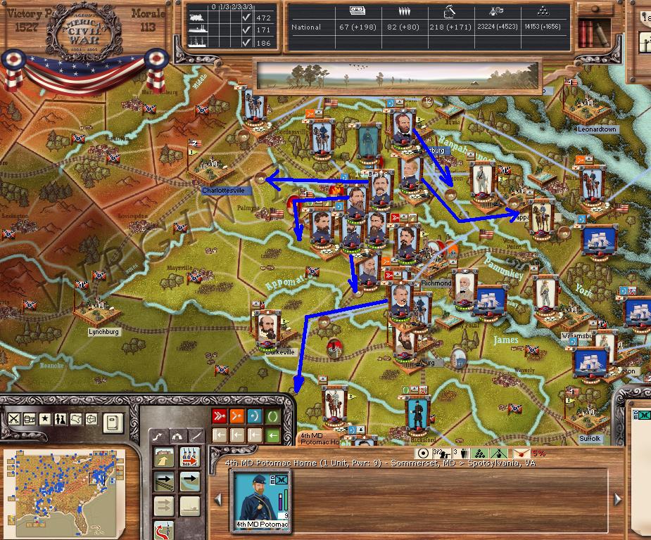 Purchases - replacements and 20 militia. Richmond is cut off, just hoping the two corps there will die with some dignity. It is pretty much a race now to see how much he can gobble up. Minor troop movements otherwise all forces need time to recover.