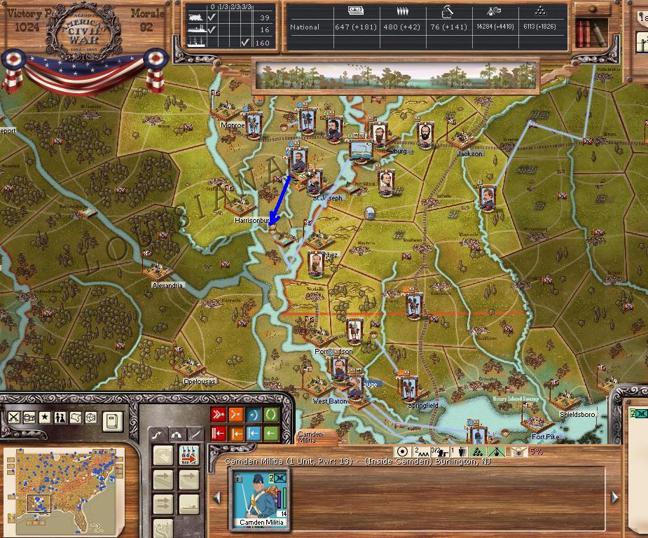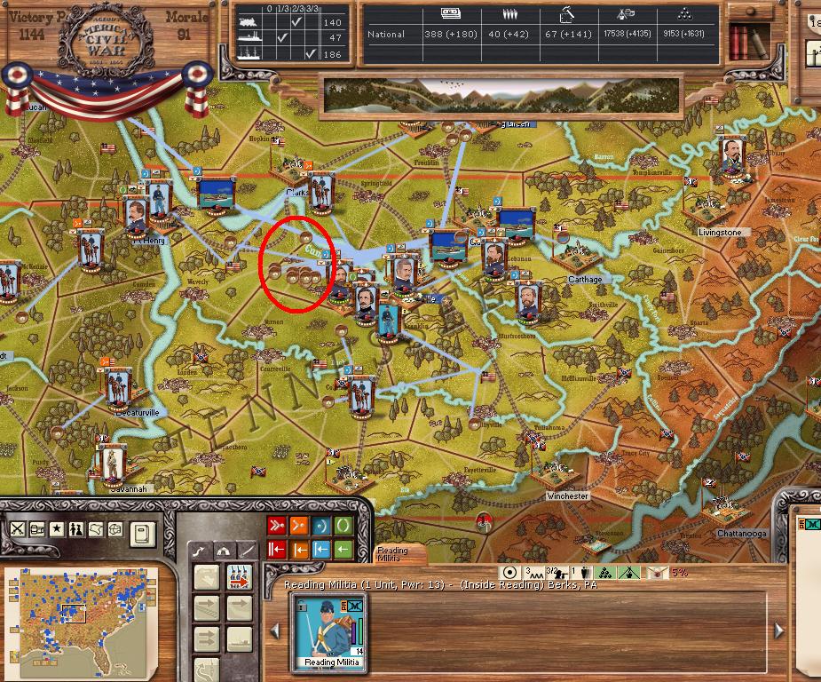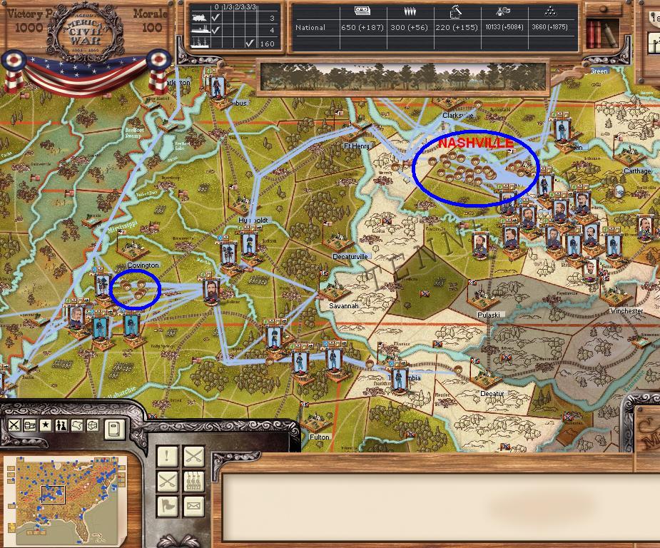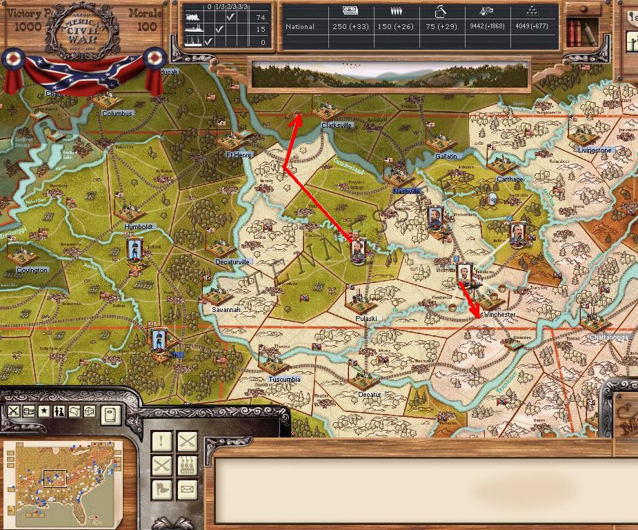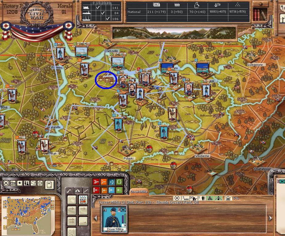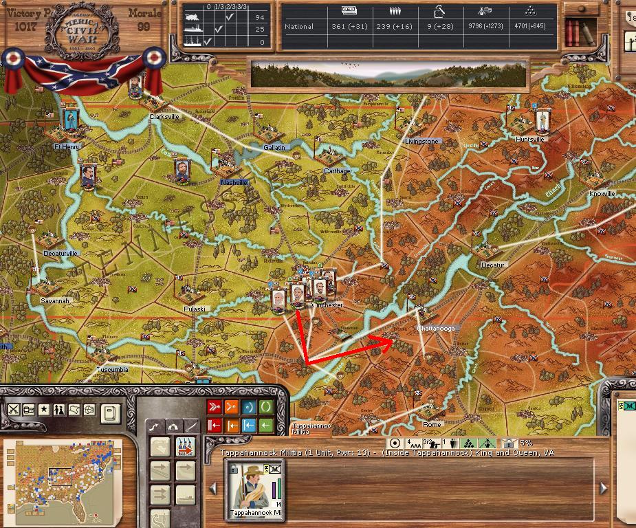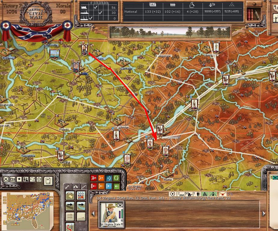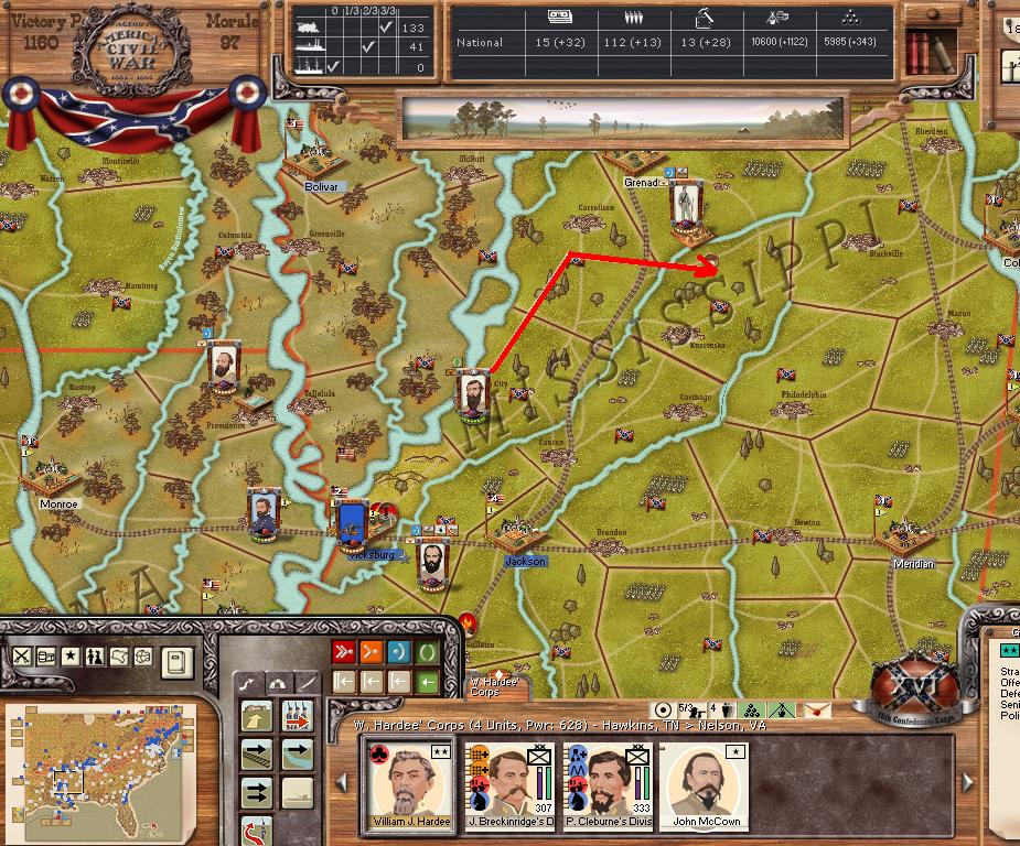 Purchases: 2 MO Cav, and 26 militia companies from VA, NC, TN, & KY. Also purchased one locomotive and one river transport, supply distribution is a real problem atm. In the east I want to hold the Rappahannock as long as possible, while using Longstreet's Corps to try and destroy any coastal lodgements, the only movements in the east are bring reinforcements up to the lines. In the west I took Clarksville with Wheeler and am trying to destroy that depot before they can retake it. I hope this will stop the advance towards chattanooga. I am withdrawing the AoTenn to the Chattanooga line and will use one of the two corps to reinforce another area (to be determined.) Along the MS, I am try to delay Grants crossing, but once his is across I will abandon Vicksburg hopefully destroying the depot and withdraw into the interior. In the far west I am using mobile forces to try again to attack depots to stall offensives. Watie and Bee will be my primary mobile commanders. If succussful in destroying the Army of Southwest supply line and forcing them to withdraw, I will pull far west forces and try to get them over the MS.